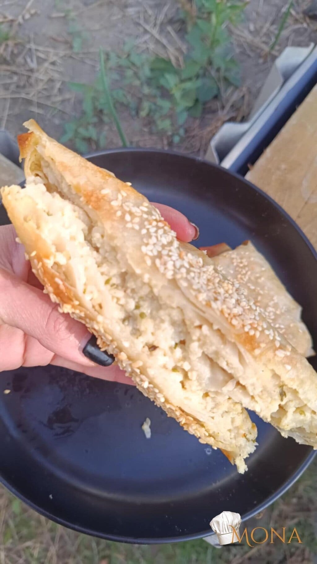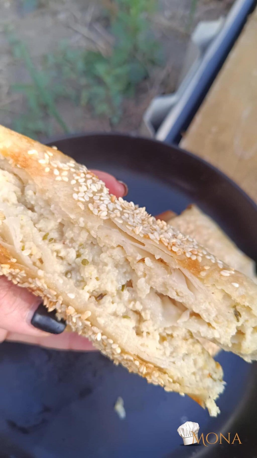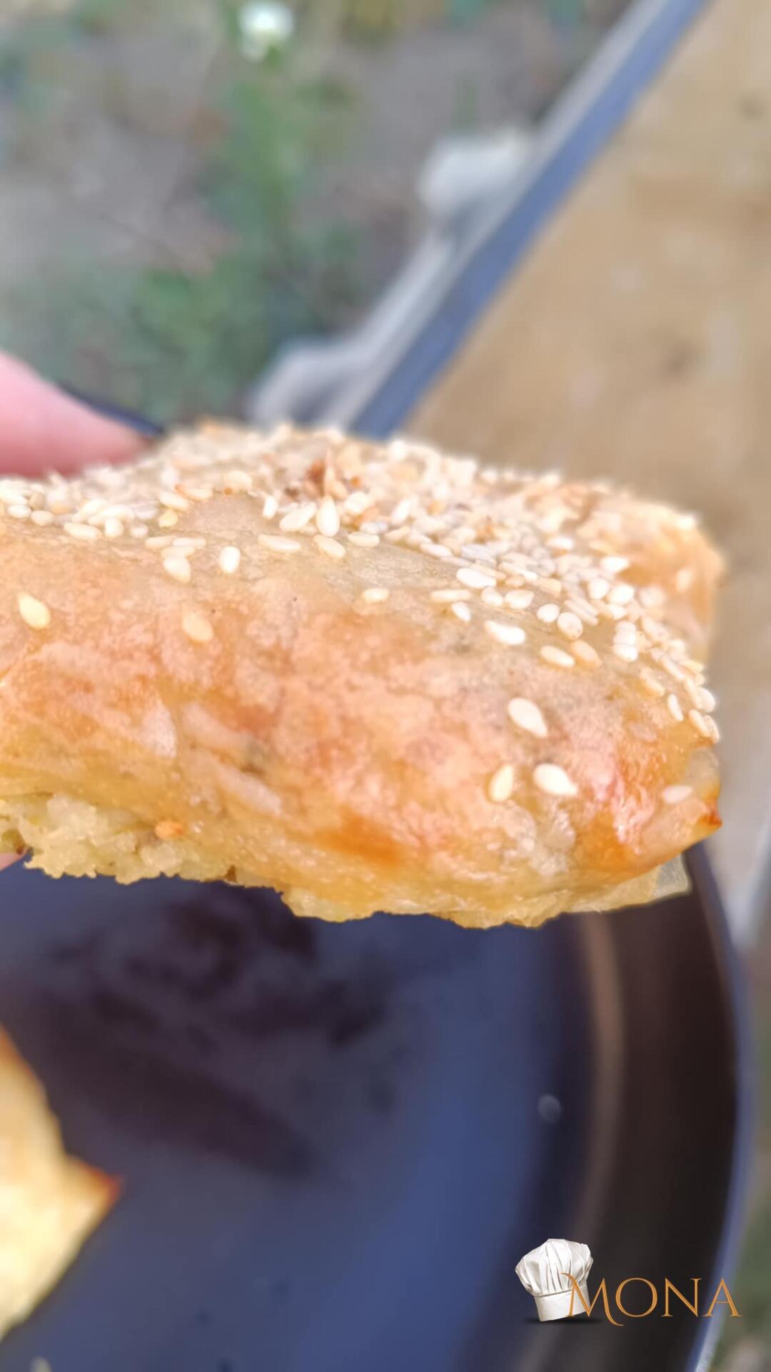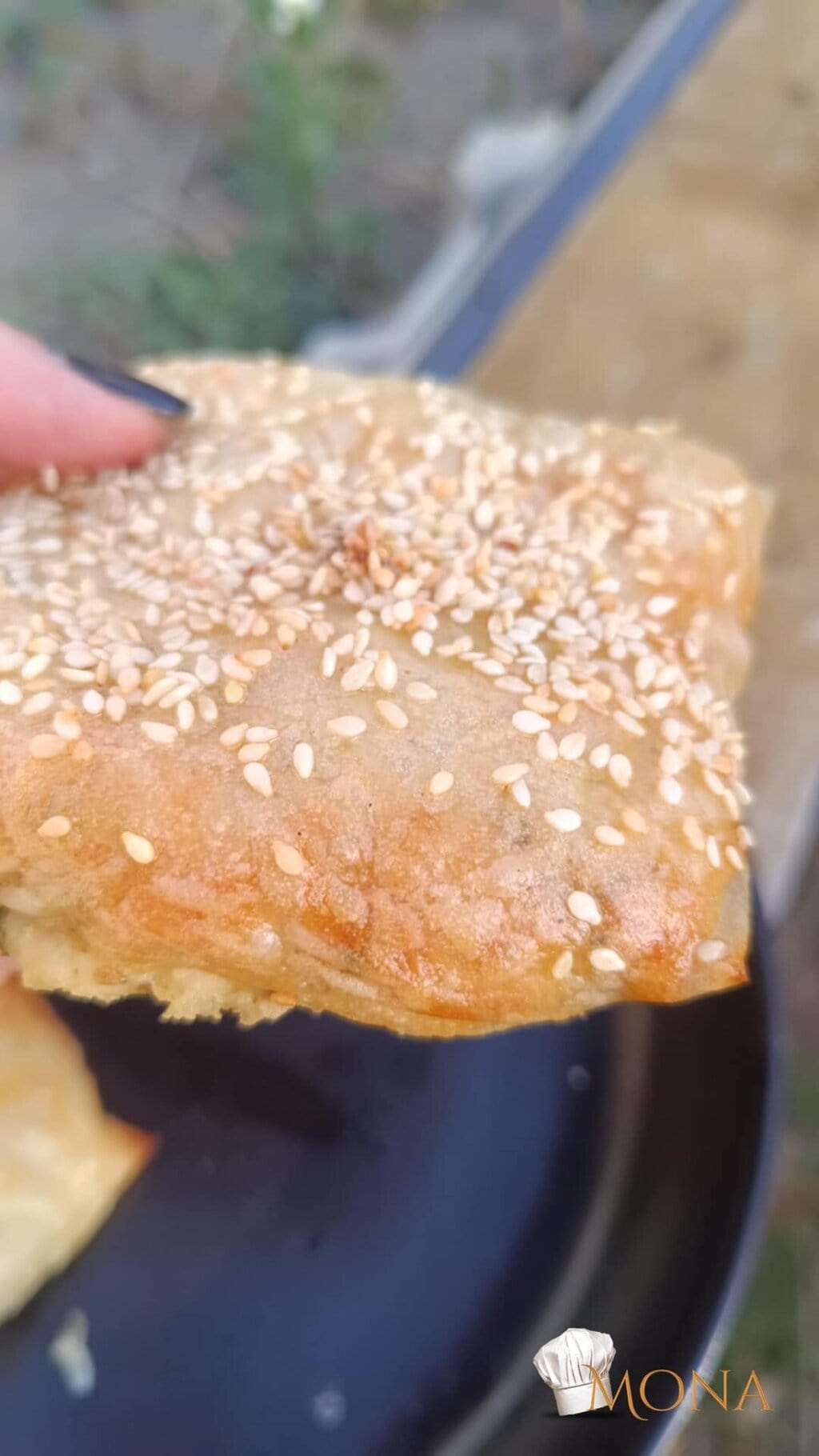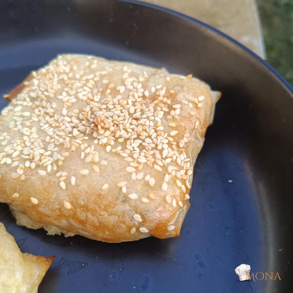Sütőpapíros tepsire tesszük, a hajtás lefele legyen, lekenjük olajjal vékonyan, megszórjuk szezámmaggal, majd 180-190 fokos sütőben kb. 25-30 perc alatt megsütjük.