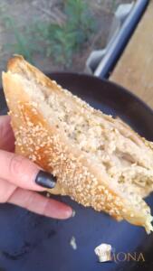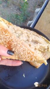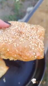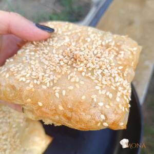 Sütőpapíros tepsire tesszük, a hajtás lefele legyen, lekenjük olajjal vékonyan, megszórjuk szezámmaggal, majd 180-190 fokos sütőben kb. 25-30 perc alatt megsütjük.