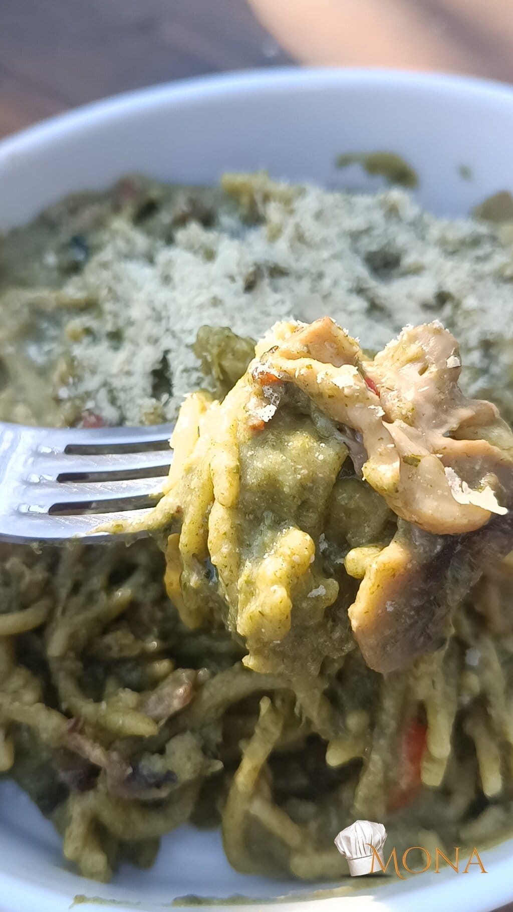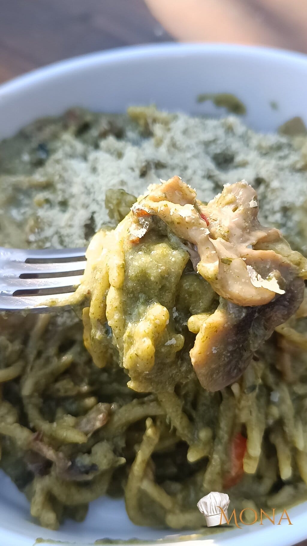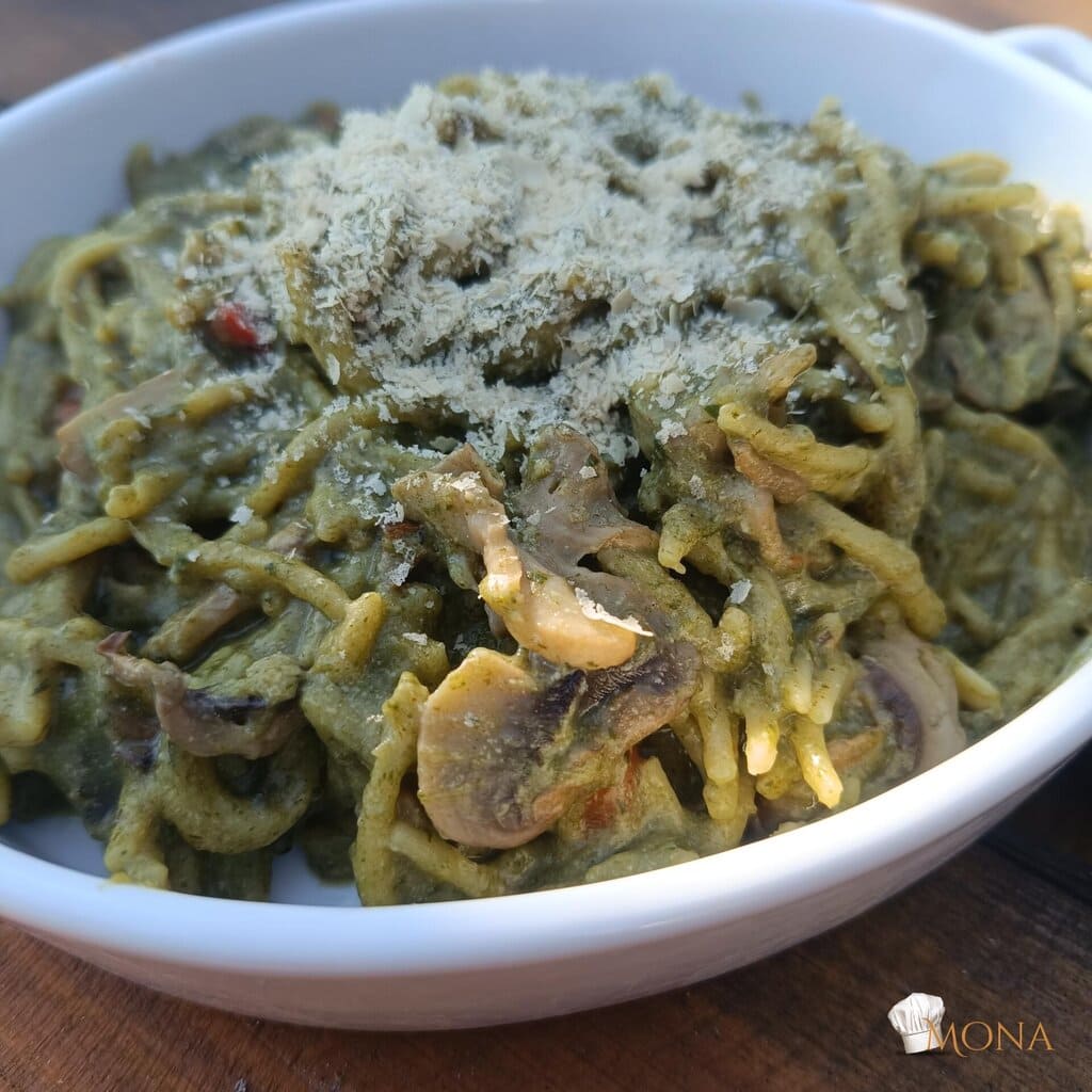 A spagettit kifőzzük, majd ha kész, akkor összekeverjük a spenótos – gombás keverékkel.