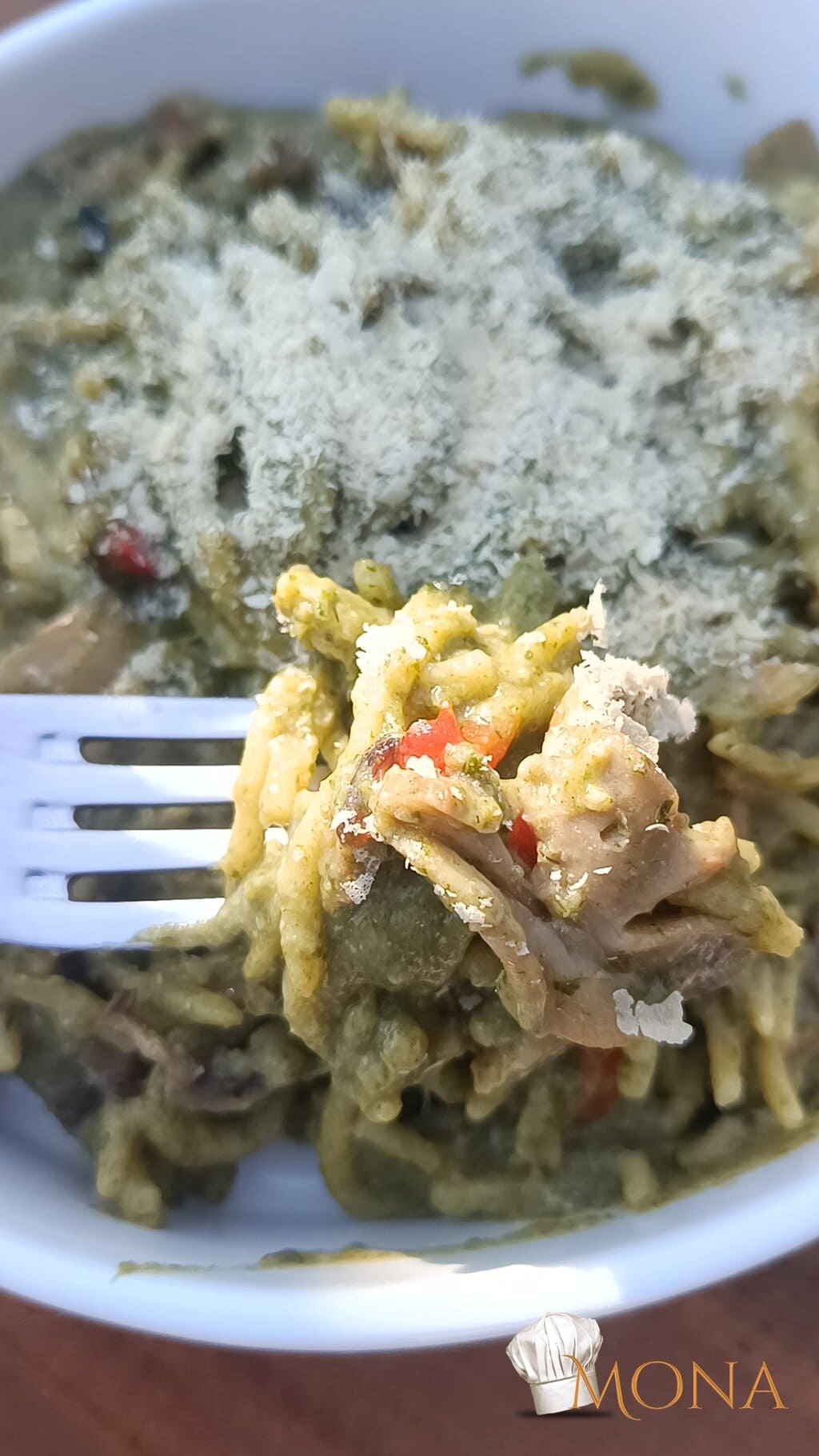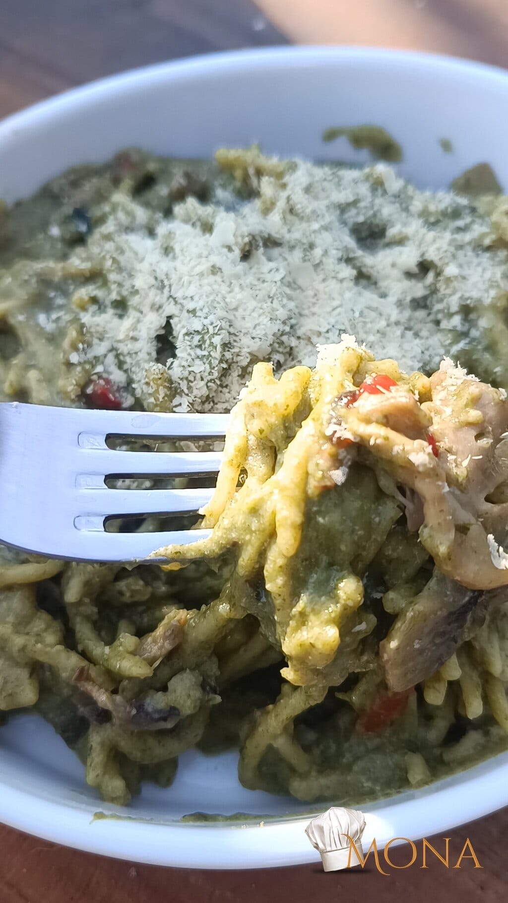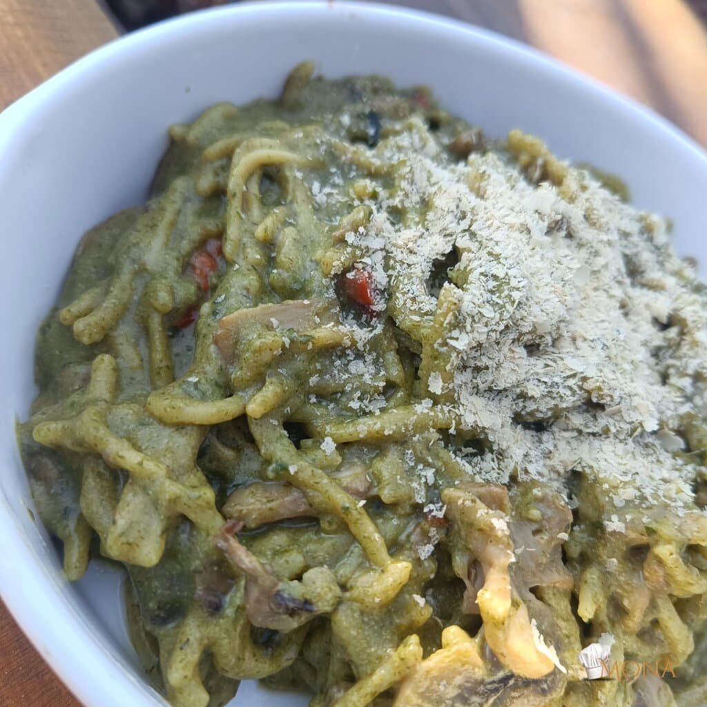 A spagettit kifőzzük, majd ha kész, akkor összekeverjük a spenótos – gombás keverékkel.