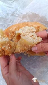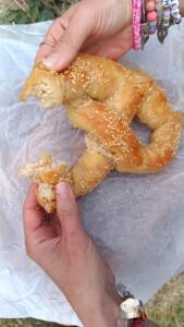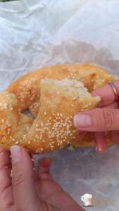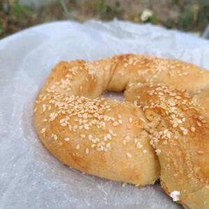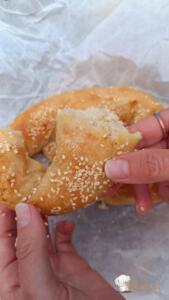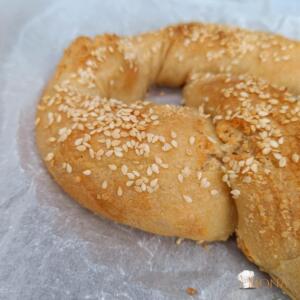 Sütőpapíros tepsire tesszük, olajjal vékonyan lekenjük, megszórjuk sóval, szezámmaggal.