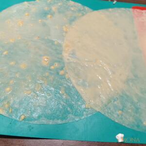 Egy rizlapot alaposan belemártunk, majd szilikon lapra tesszük, majd így tovább a lapokkal és szépen tegyük egymásra – egymás mellé,