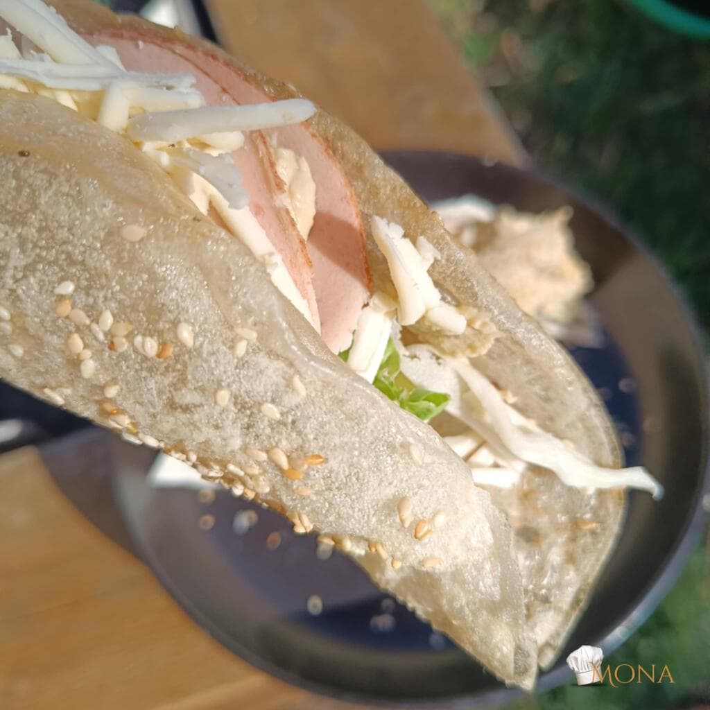 Egy lapot megmártunk a csicseris keverékbe, szilikon lapra tesszük, majd a barna rizslisztes keverék felét a közepére tesszük.