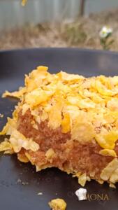 Egy 21×21 – es tepsit kibélelünk sütőpapírral, majd a corn flakes egyik felét belemorzsoljuk.