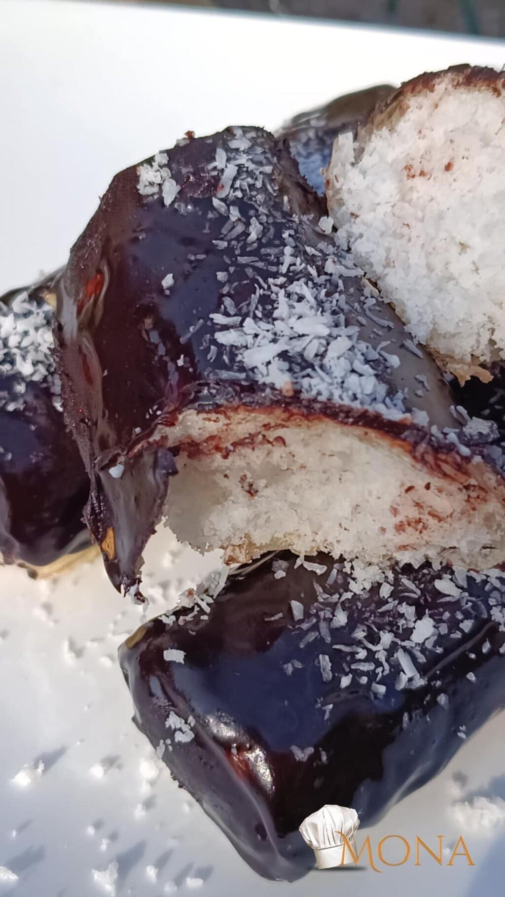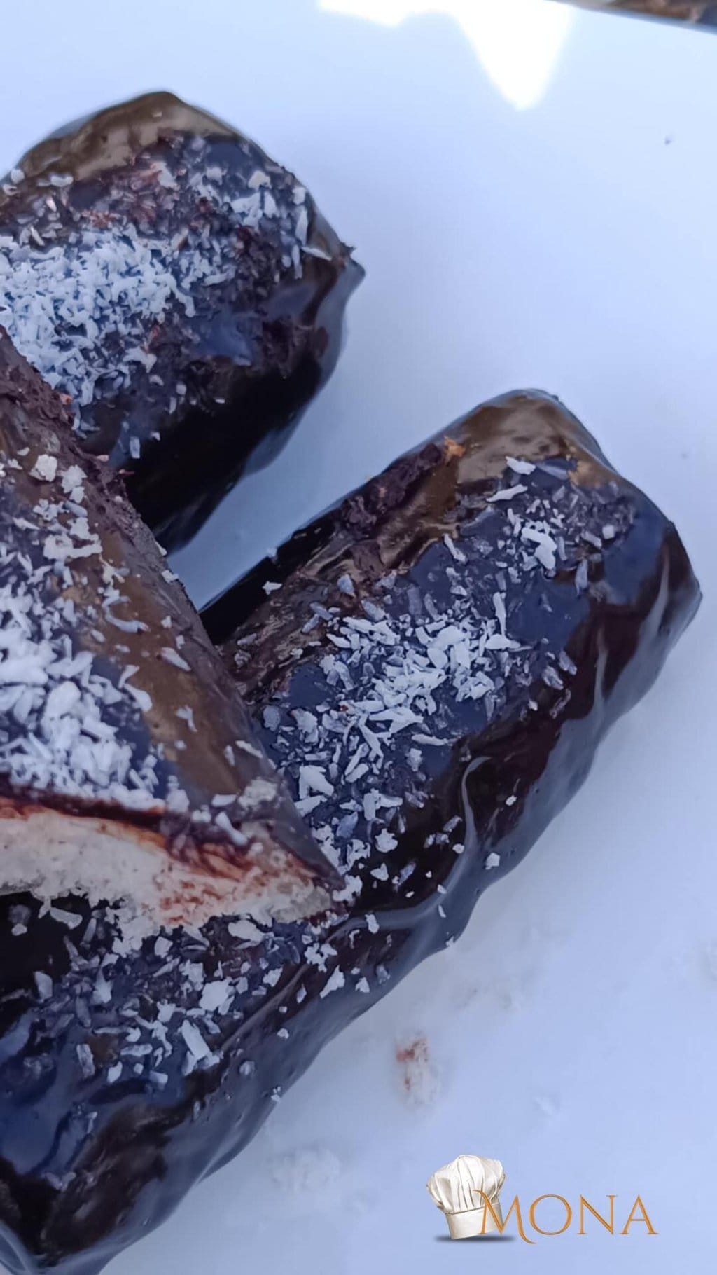 Csokival bevonjuk, megszórjuk kókuszreszelékkel, majd hagyjuk, hogy megdermedjen.