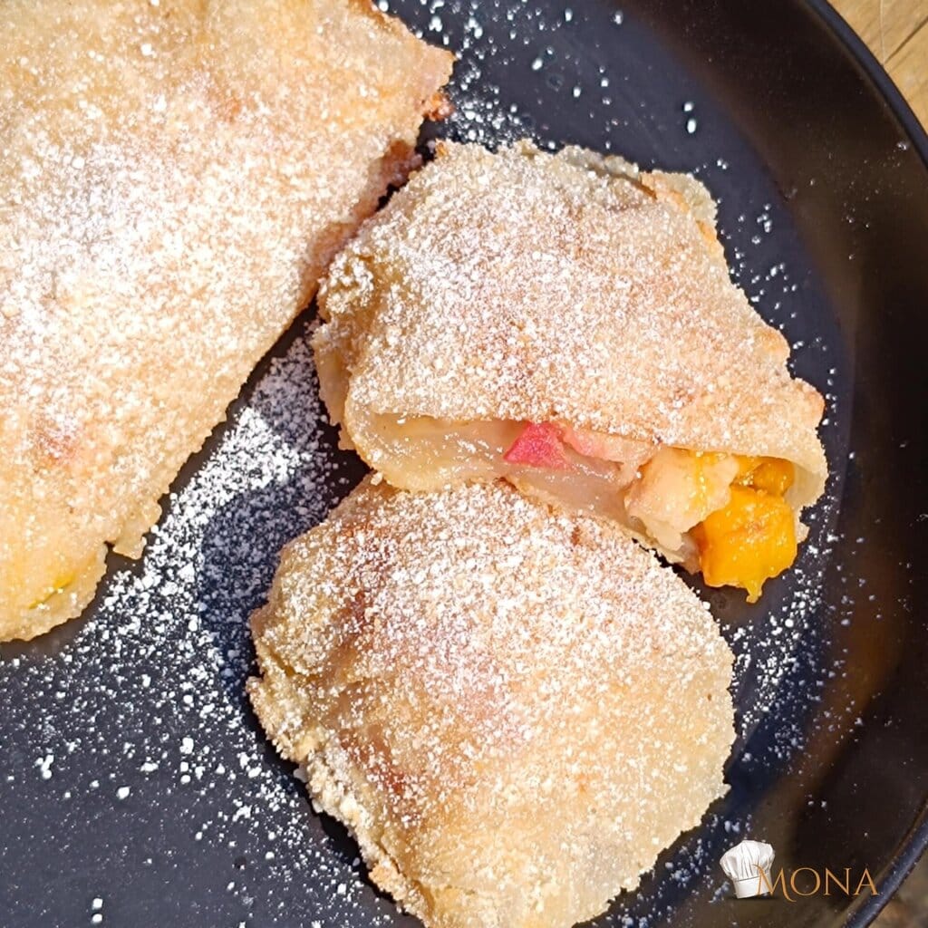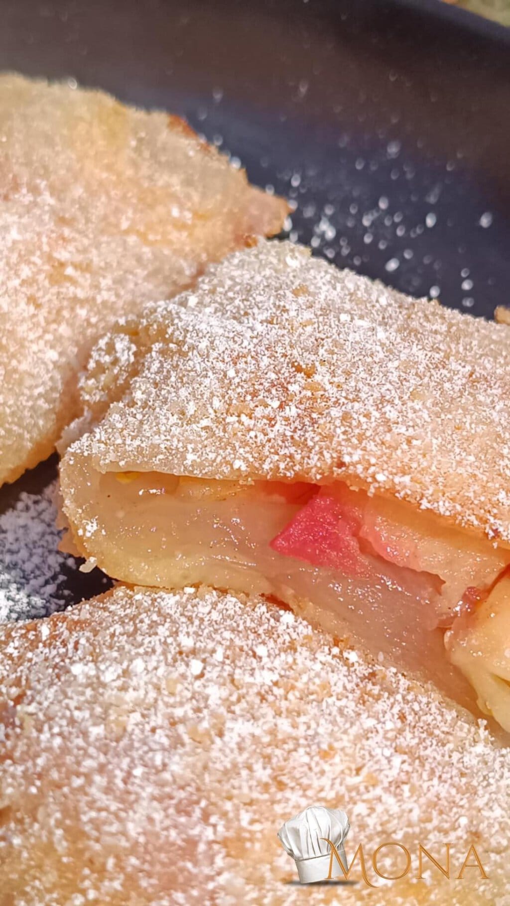 Fogunk egy rizslapot és alaposan vízbe mártjuk, majd szilikon vagy műanyag lapra tesszük, beletesszük a közepére az almás keverék egyharmadát, két szélét rájatjuk, majd a másik két szélét is.