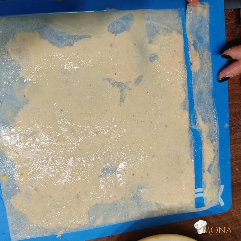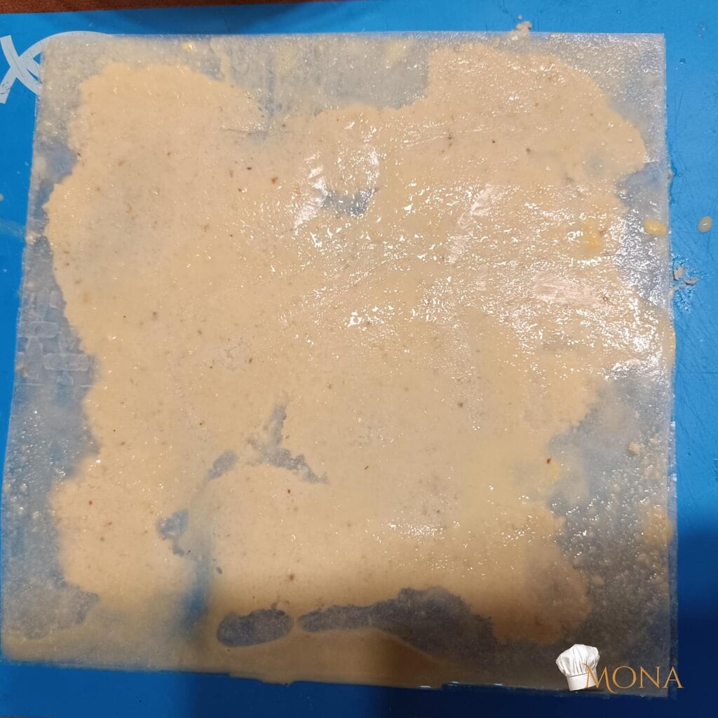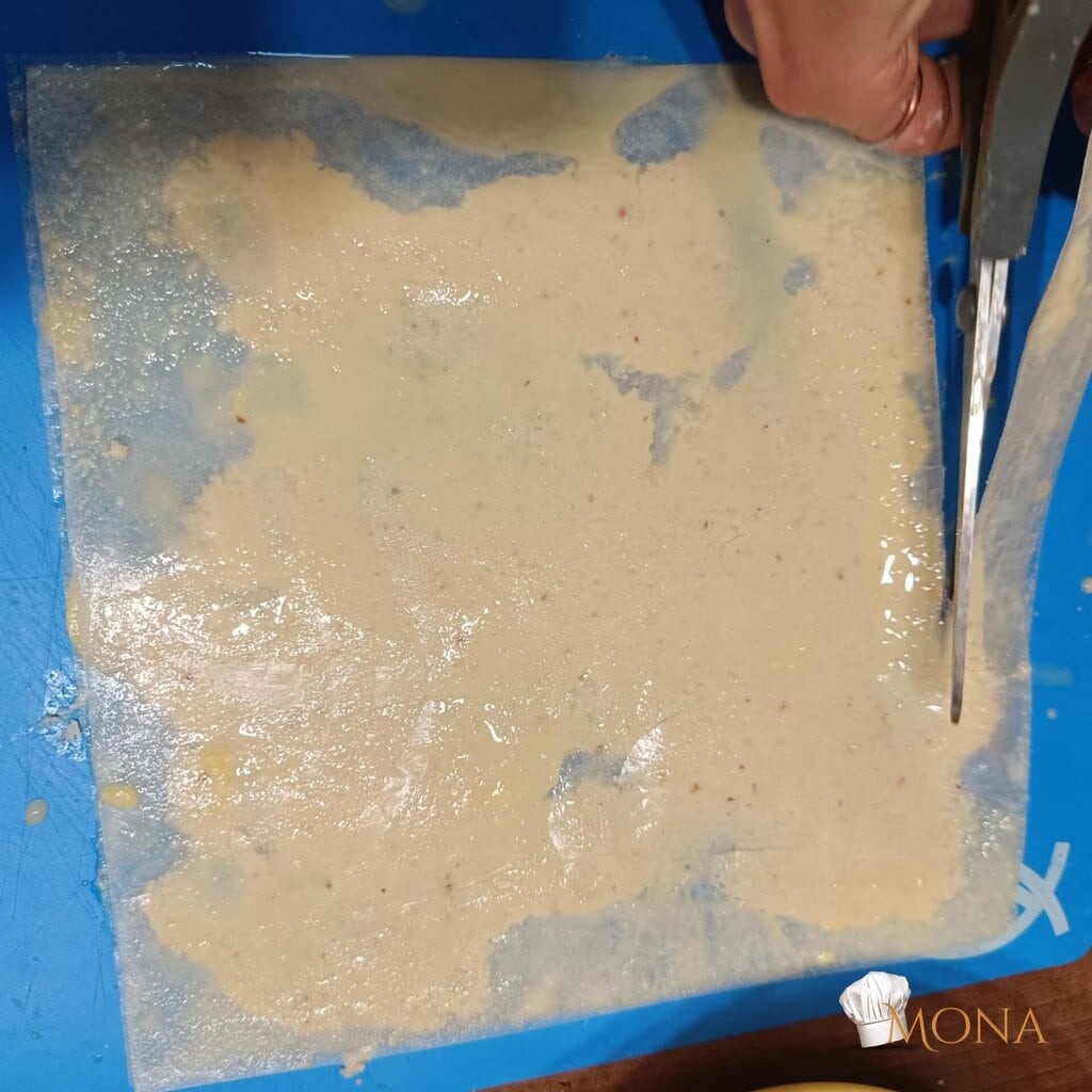 Egy rizslapot alaposan megmártunk a csicseris keverékbe, múanyag vágólapra tesszük, megkenjük a mandulalisztes keverékkel, majd egy másik lapot is megmártunk a csicseris keverékbe, majd rátesszük a mandulás keverékkel megkent lapra.