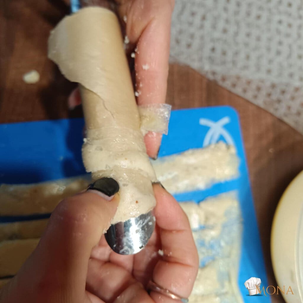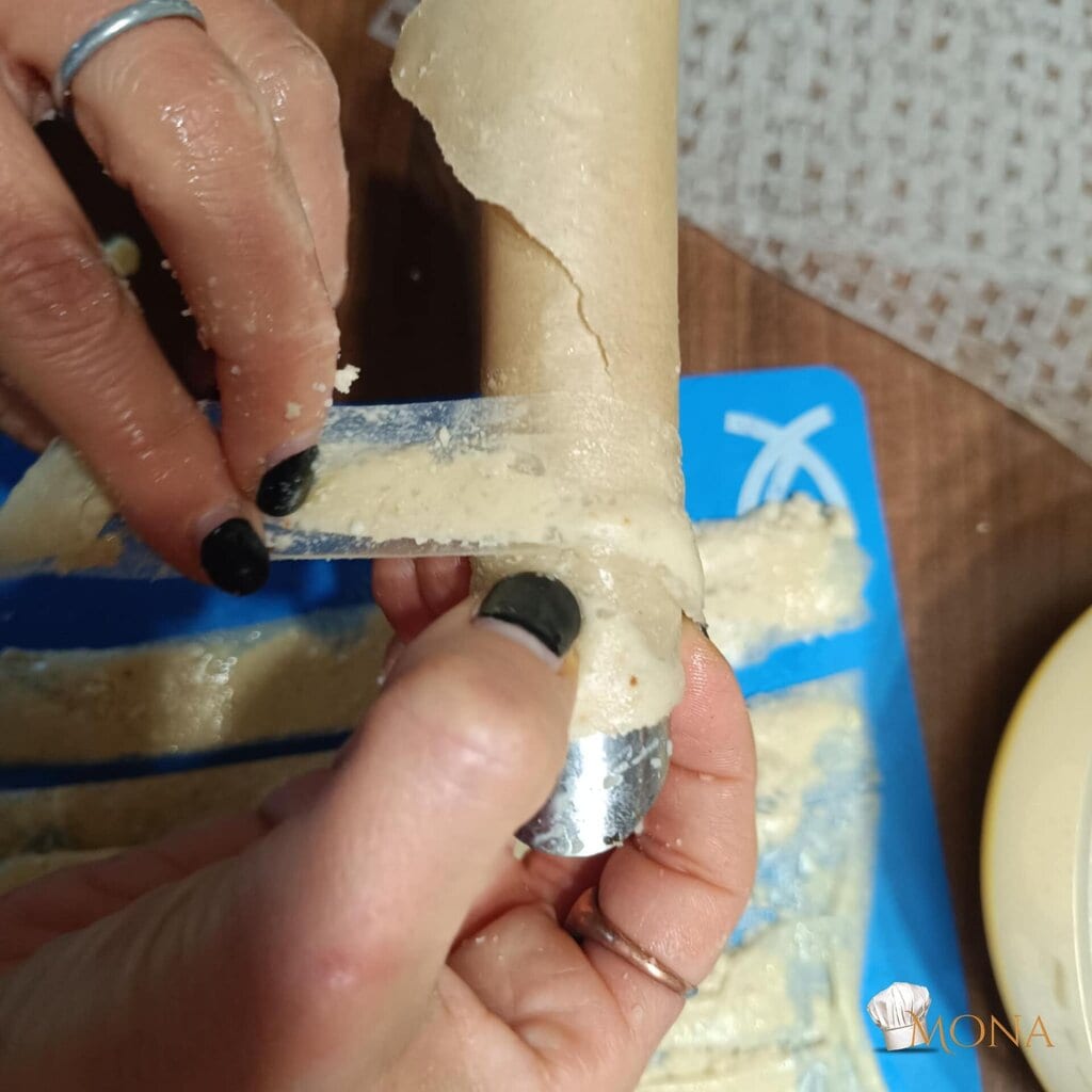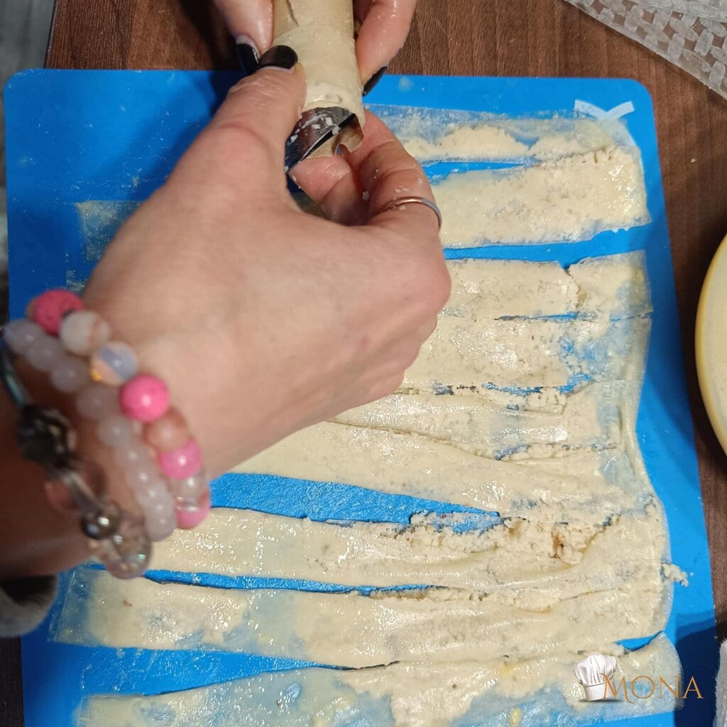 Majd a fele adag csíkokat az egyik formára rátekerjük. Majd a másik fele csíkokat egy másikra.