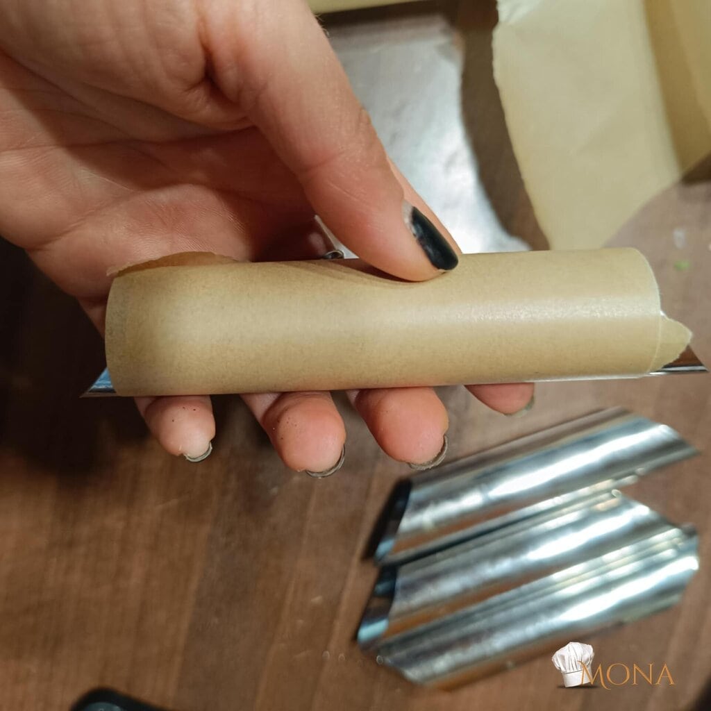 4 db roló formát előveszünk, sütőpapírt tekerünk rá.