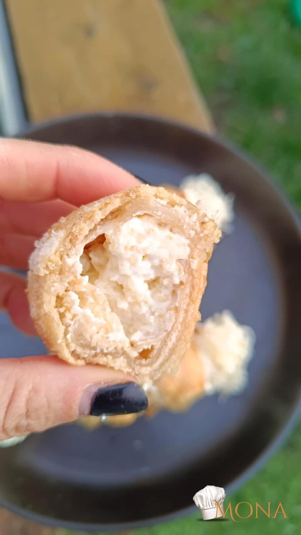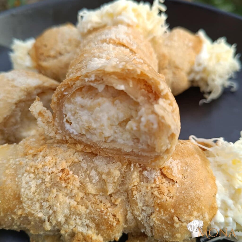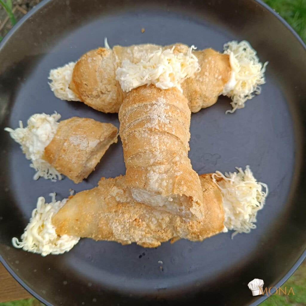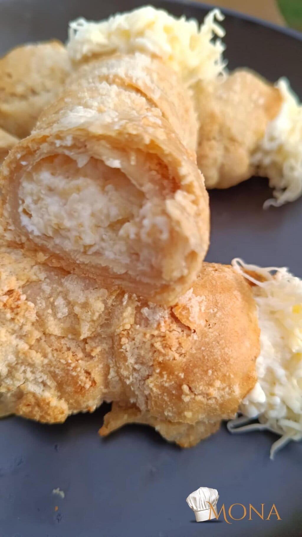 A töltelék alapanyagait kikeverjük ( némi reszelt sajtot hagyjunk meg ), majd betöltjük a rolókat ( én habnyomót használtam hozzá ), széleiket megforgatjuk a reszelt növényi sajtban.