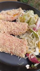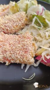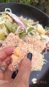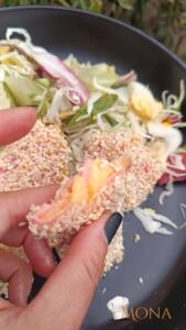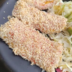 Jó alaposan megforgatjuk szezámmagban, majd sütőpapíros tepsire tesszük.