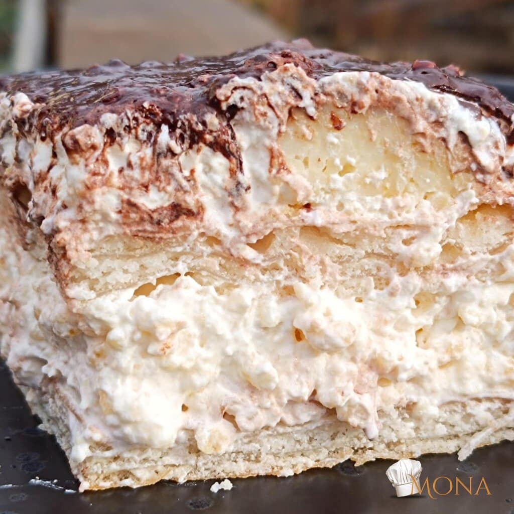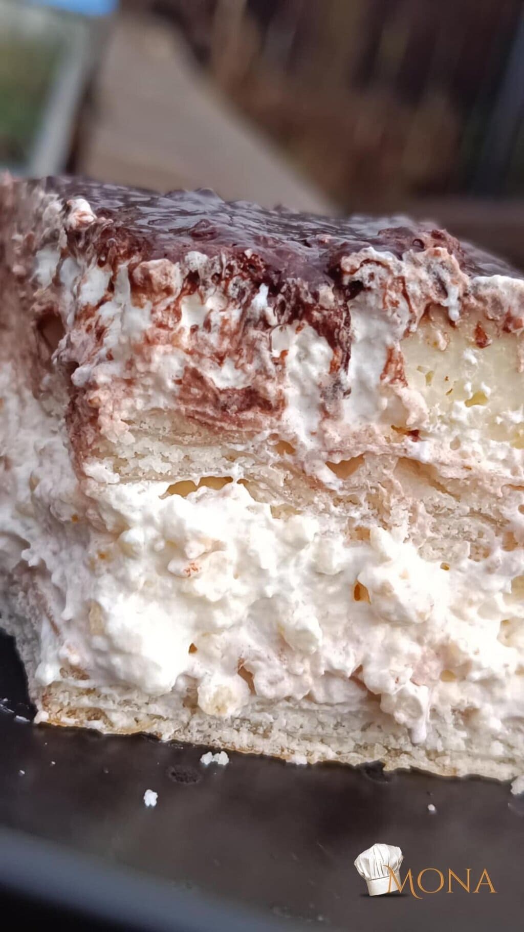 Majd az egyik megsült „lapot” egy sütőpapírral bélelt tepsibe tesszük ( én kocka rizslapokat használtam, így a 21×21 – es forma tökéletes volt hozzá ), erre jön a krém fele, majd rátesszük a másik megsült ” lapot” , erre pedig a krém másik felét.