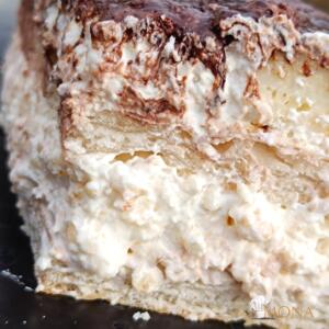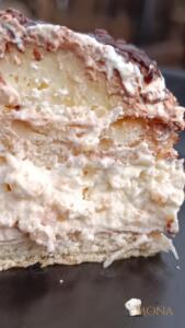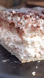 Majd az egyik megsült „lapot” egy sütőpapírral bélelt tepsibe tesszük ( én kocka rizslapokat használtam, így a 21×21 – es forma tökéletes volt hozzá ), erre jön a krém fele, majd rátesszük a másik megsült ” lapot” , erre pedig a krém másik felét.