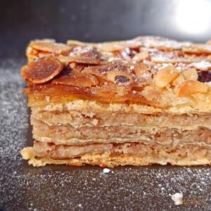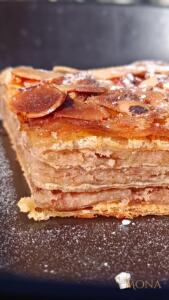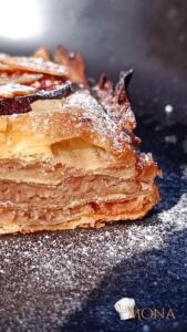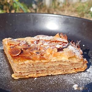 Erre teszünk a töltelékből, elkenjük rajta, majd ismét két lapot mártunk a keverékben, rátesszük az előzőre, majd krém…. ( amíg el nem fogy ) és két lappal zárjuk a sort ( ugyanugy csicseris keverékbe mártva ).
