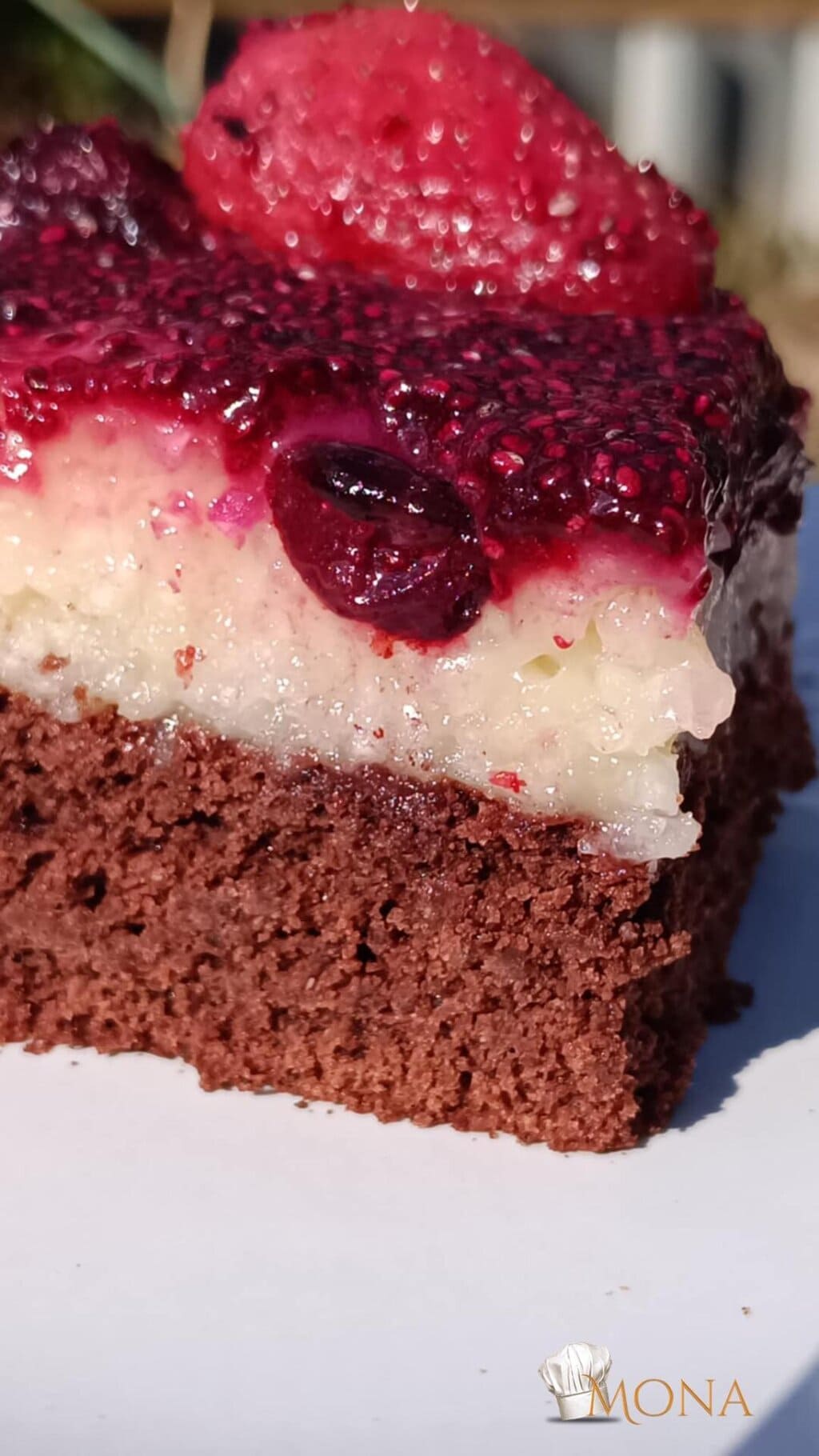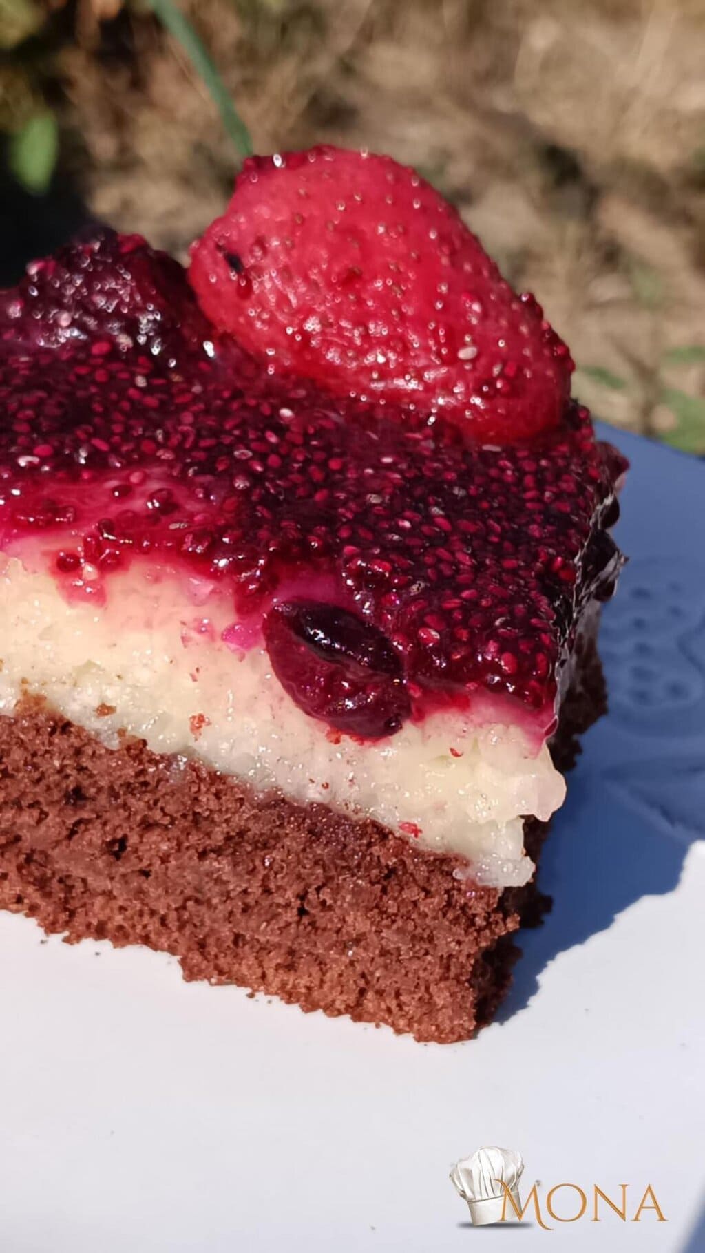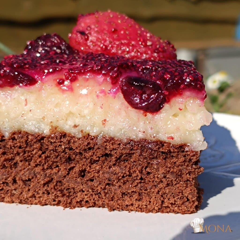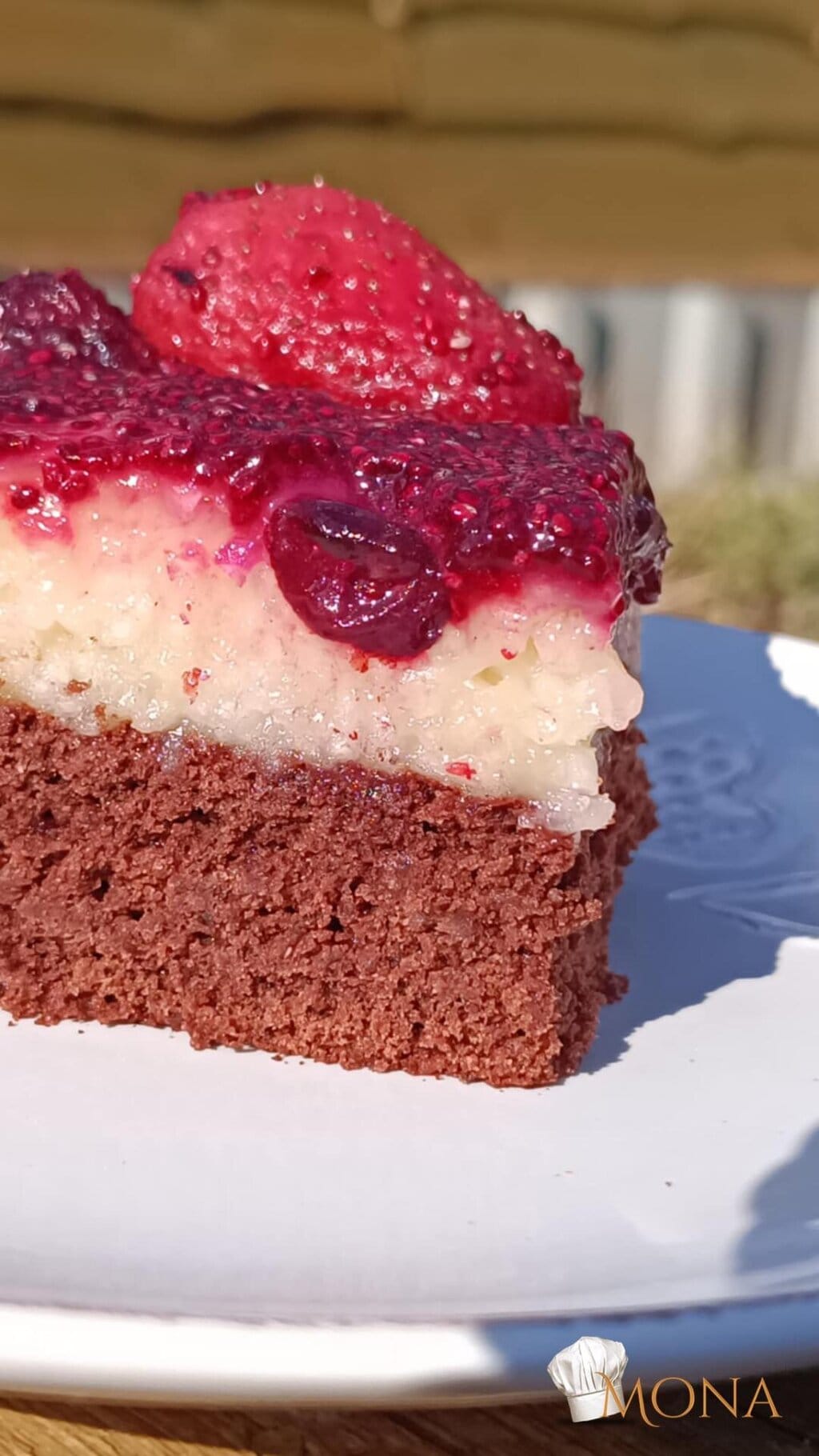 Majd ha minden elkészült, akkor a piskóta tetejére tesszük a rizses réteget, majd a gyümölcsös réteget.