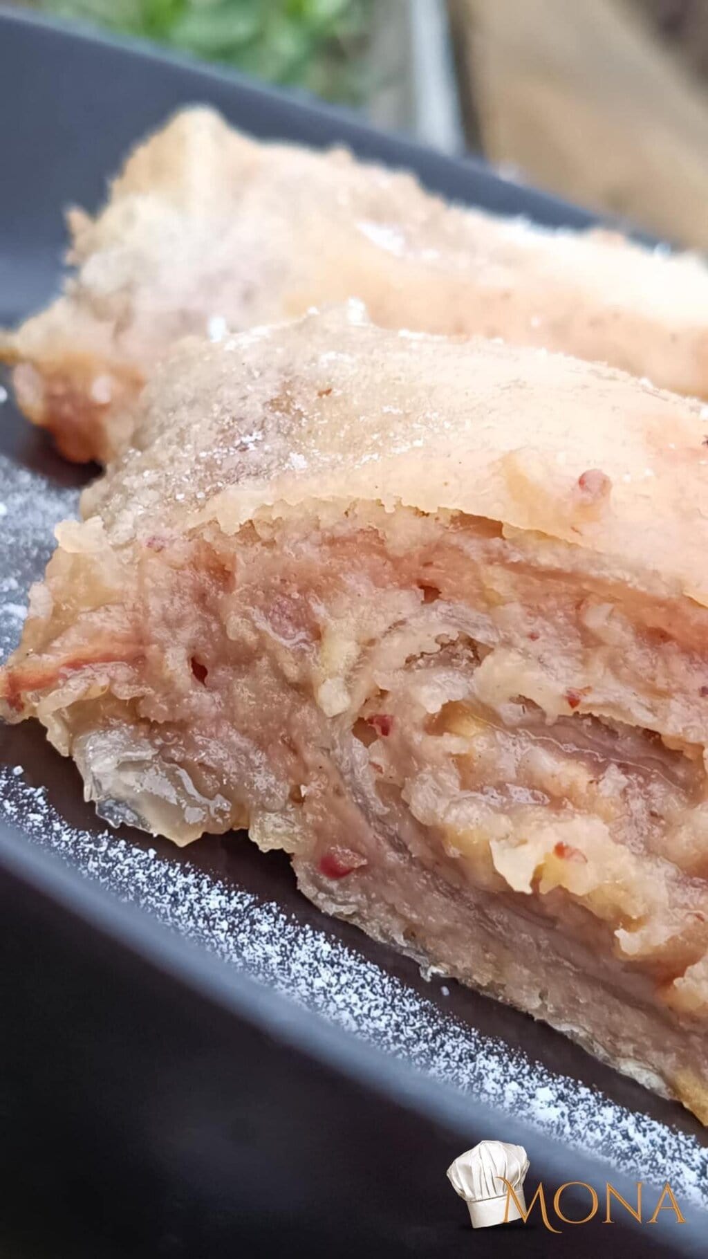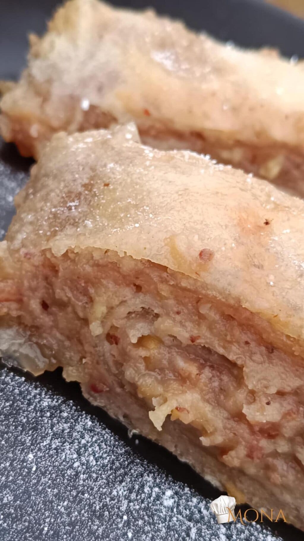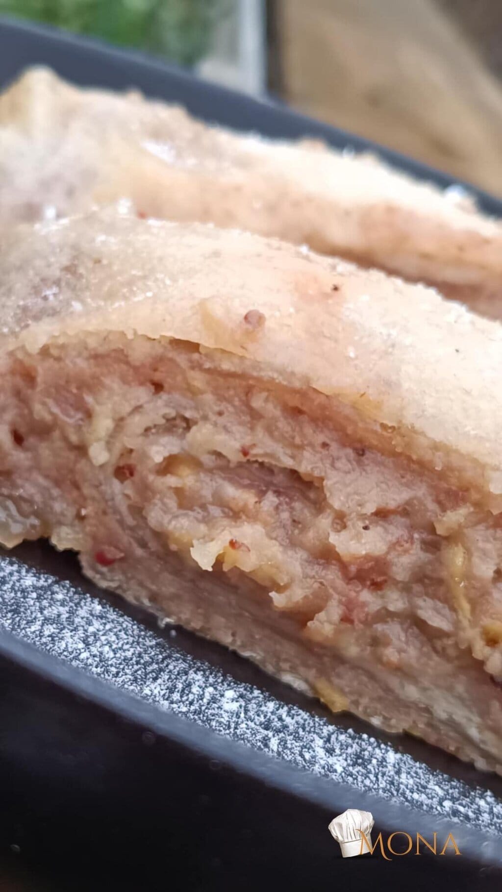 A tölteléket eloszlatjuk rajta, majd a két hosszanti szélét picit ráhajtjuk ( mint a hagyományos bejglinél ), majd feltekerjük.