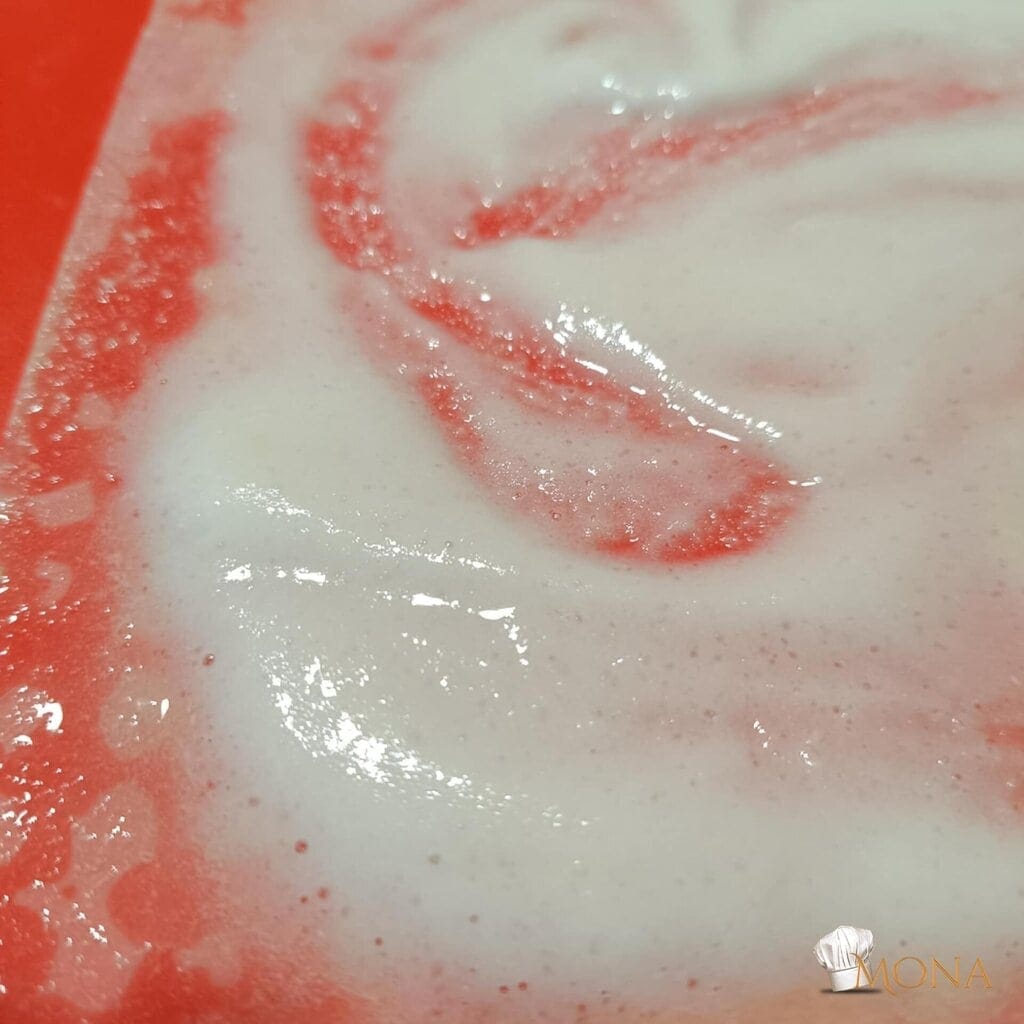A barna rizslisztes keverékből teszünk a közepébe, eloszlatjuk.