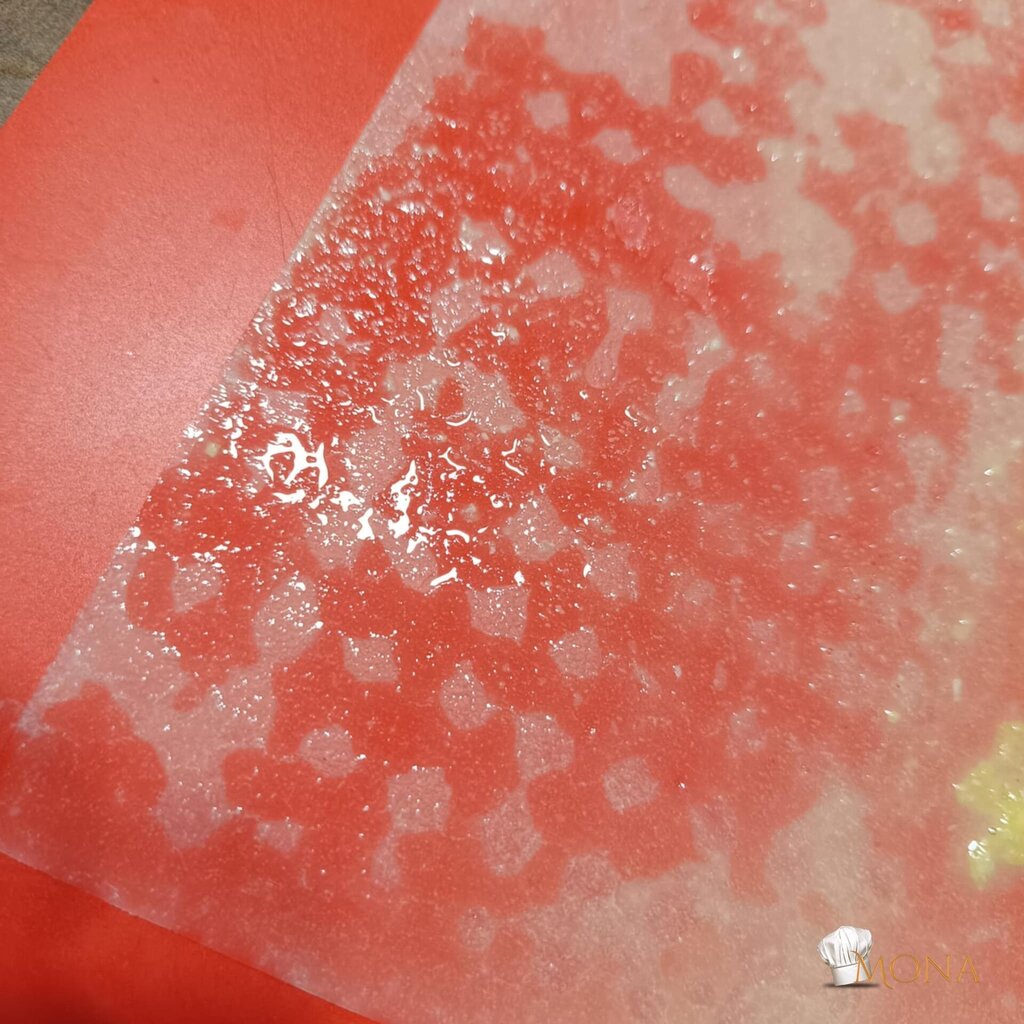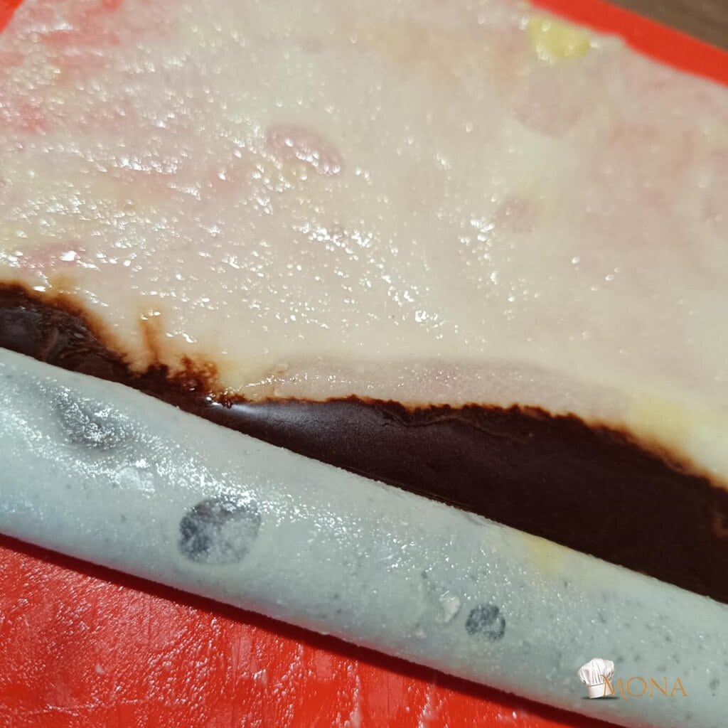 Egy rizslapot megmártunk a csicseris keverékben, szilikon vagy műanyag lapra tesszük.