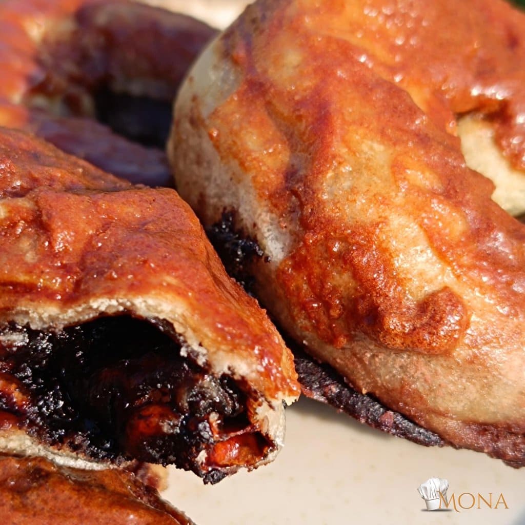 Utána a kakaós masszából teszünk az egyik oldalára, elegyengetjük, majd feltekerjük, és egy karika alakot formázunk belőle.