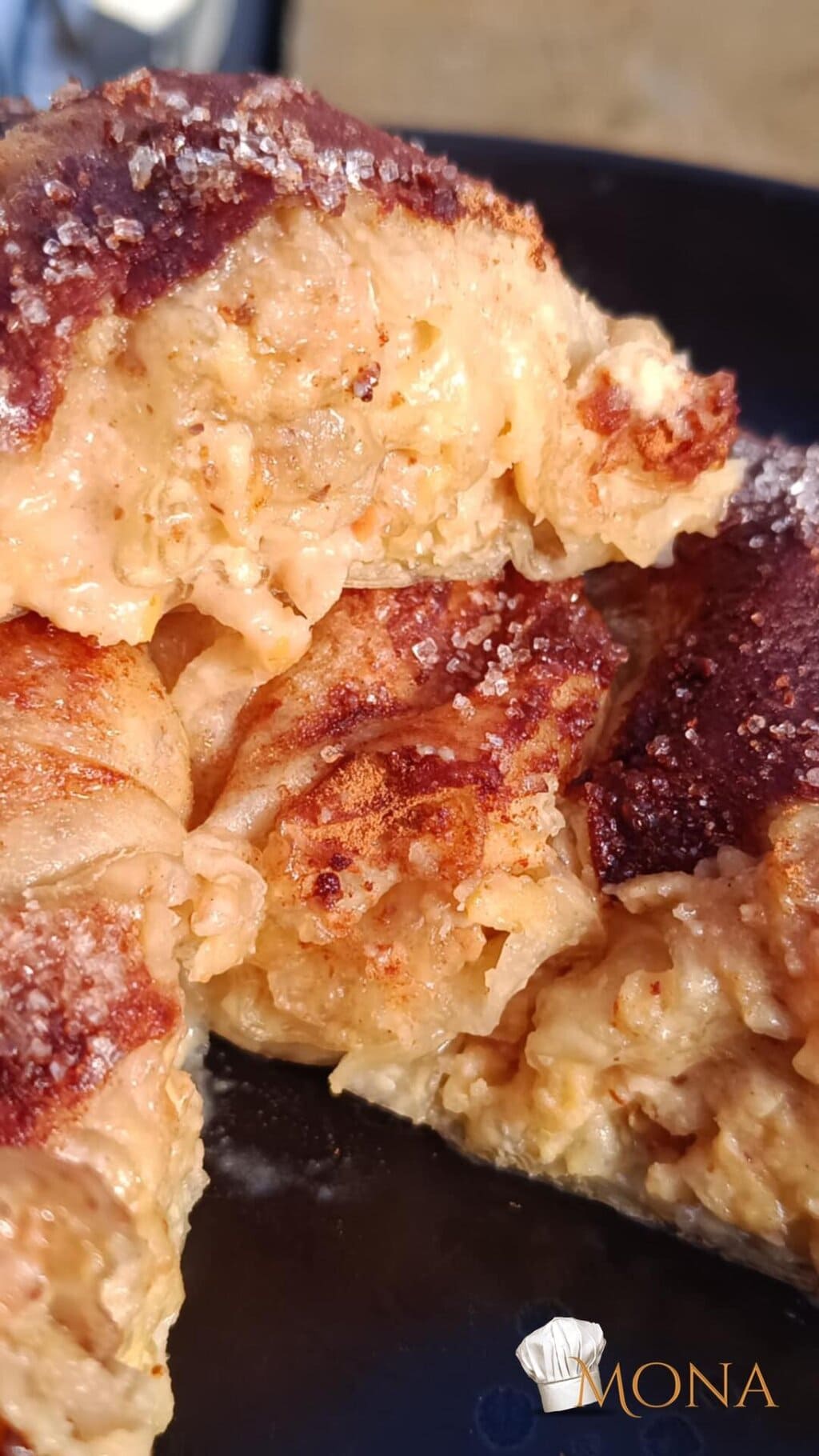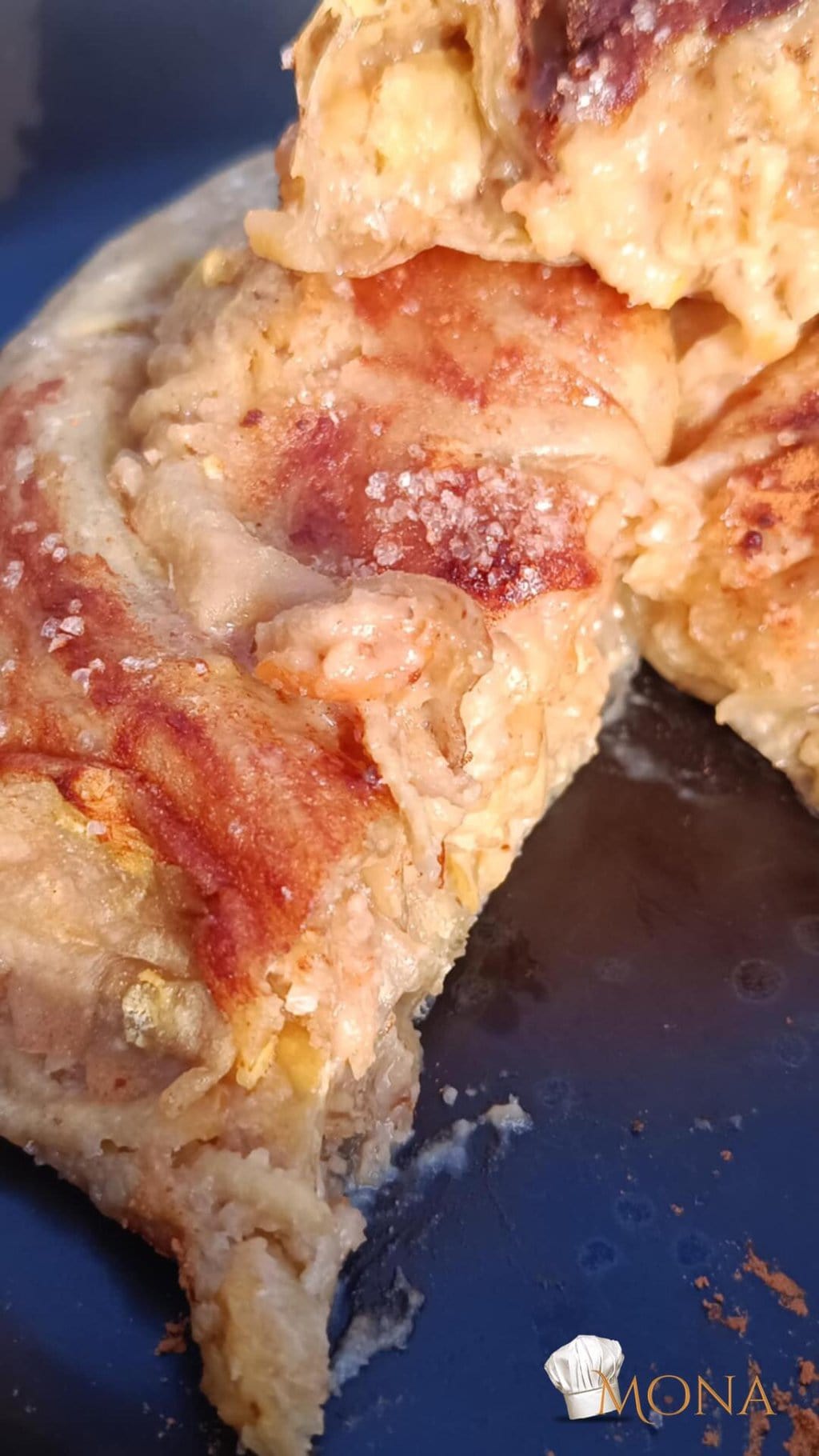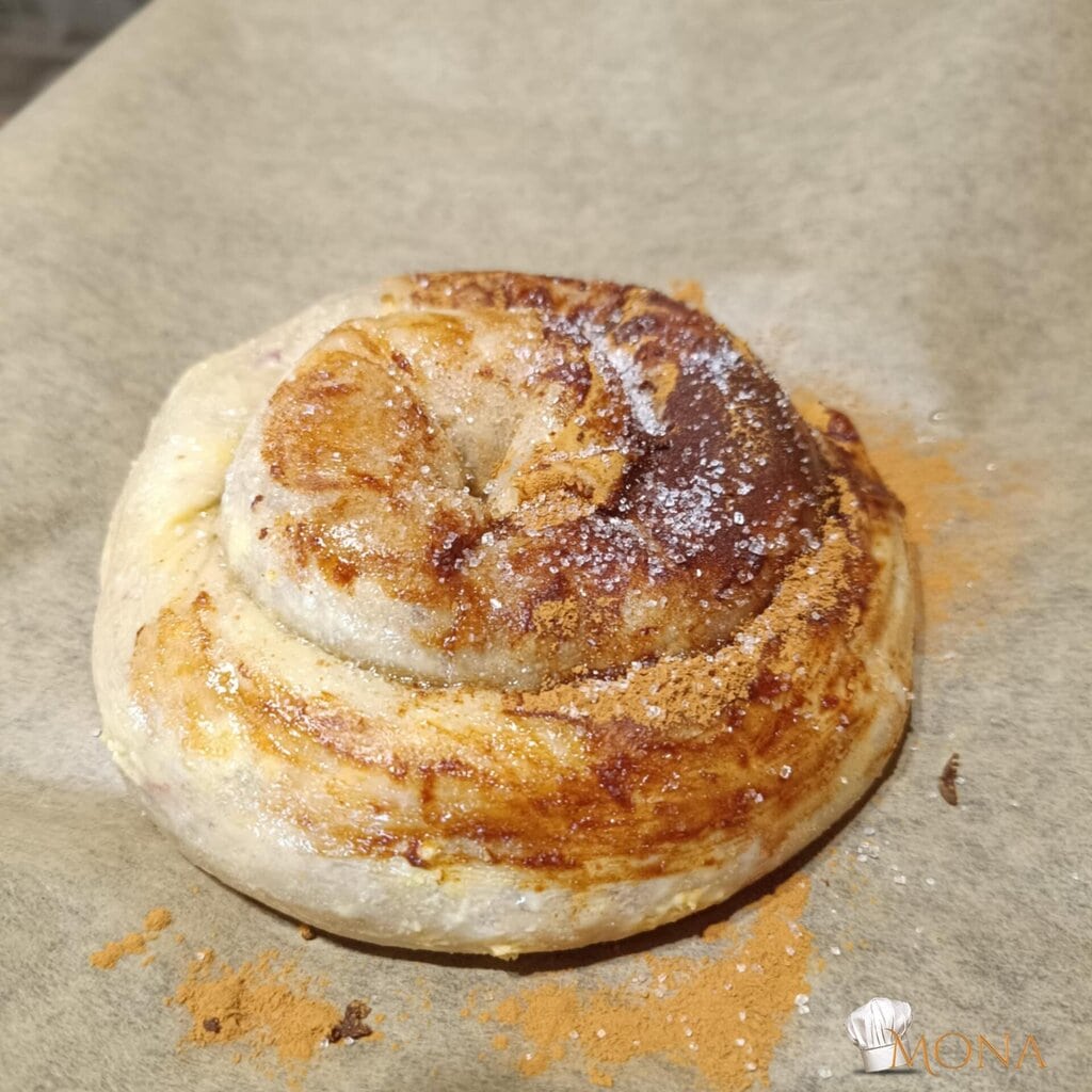 Sütőpapíros tepsire tesszük, olajjal vékonyan lekenjük, egyik oldalát fahéjjal szórjuk, tetejére pedig édesítőt.