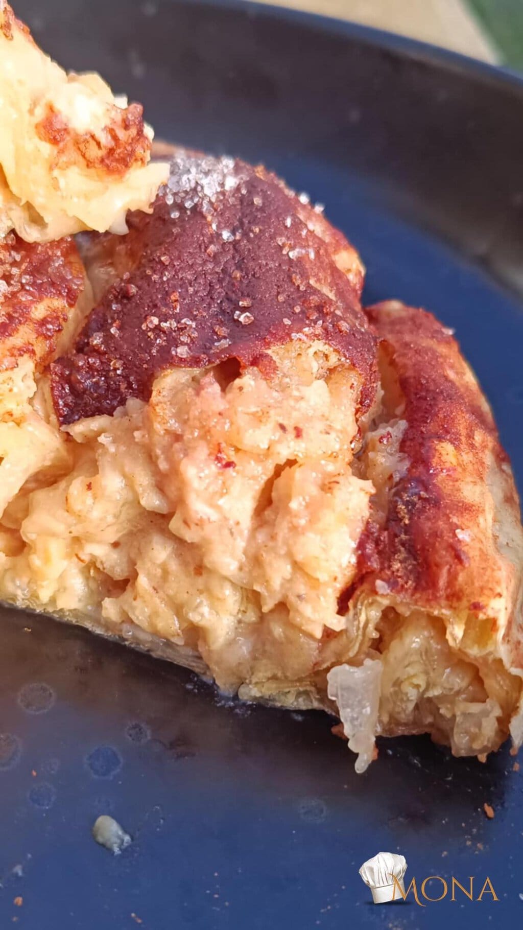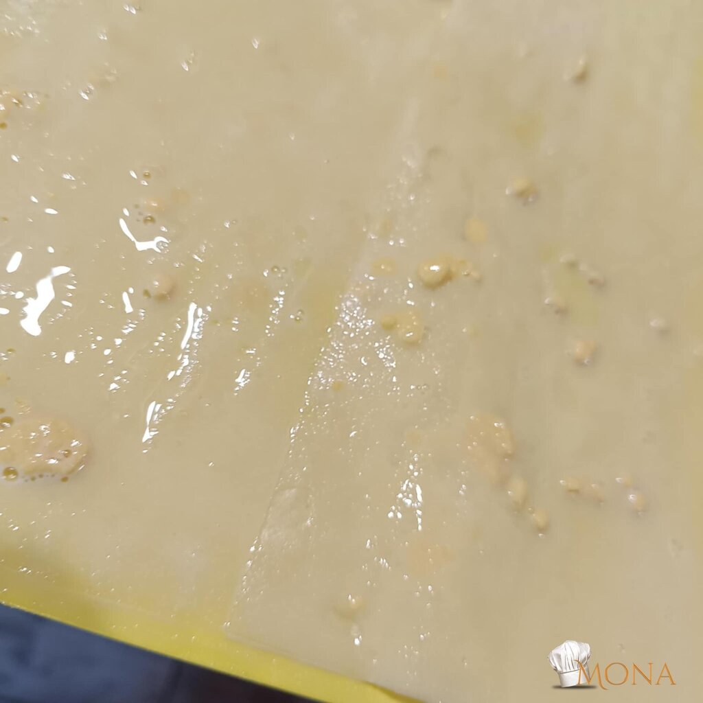 3 db rizslapot előveszünk, egyesével alaposan belemártjuk a csicseris keverékbe, majd egymás mellé tesszük őket, hogy a széleik egymásba is érjenek.