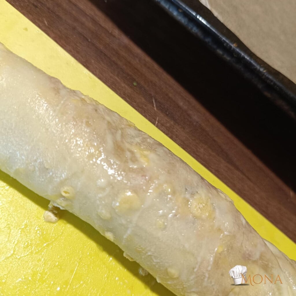 A hosszanti oldalától feltekerjük, majd pedig az egyik végétől feltekerjük.