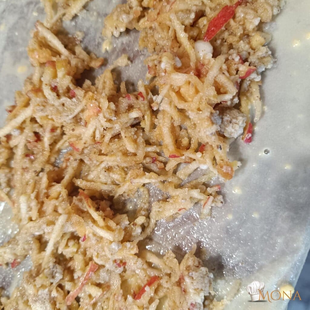 Az almát, diót és az édesítőt összekeverjük, majd eloszlatjuk a rizslapokon.