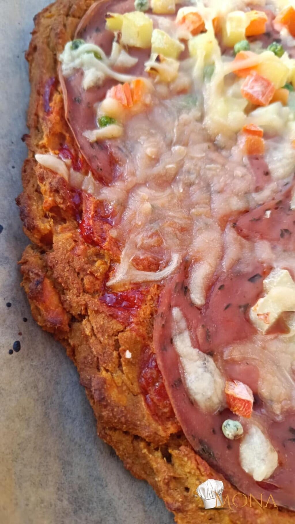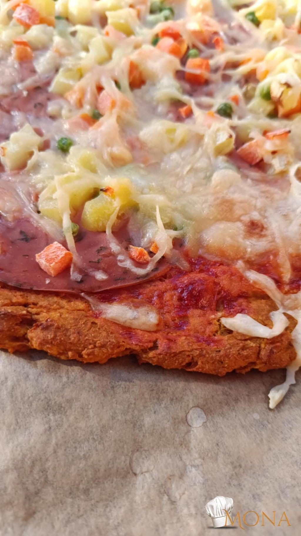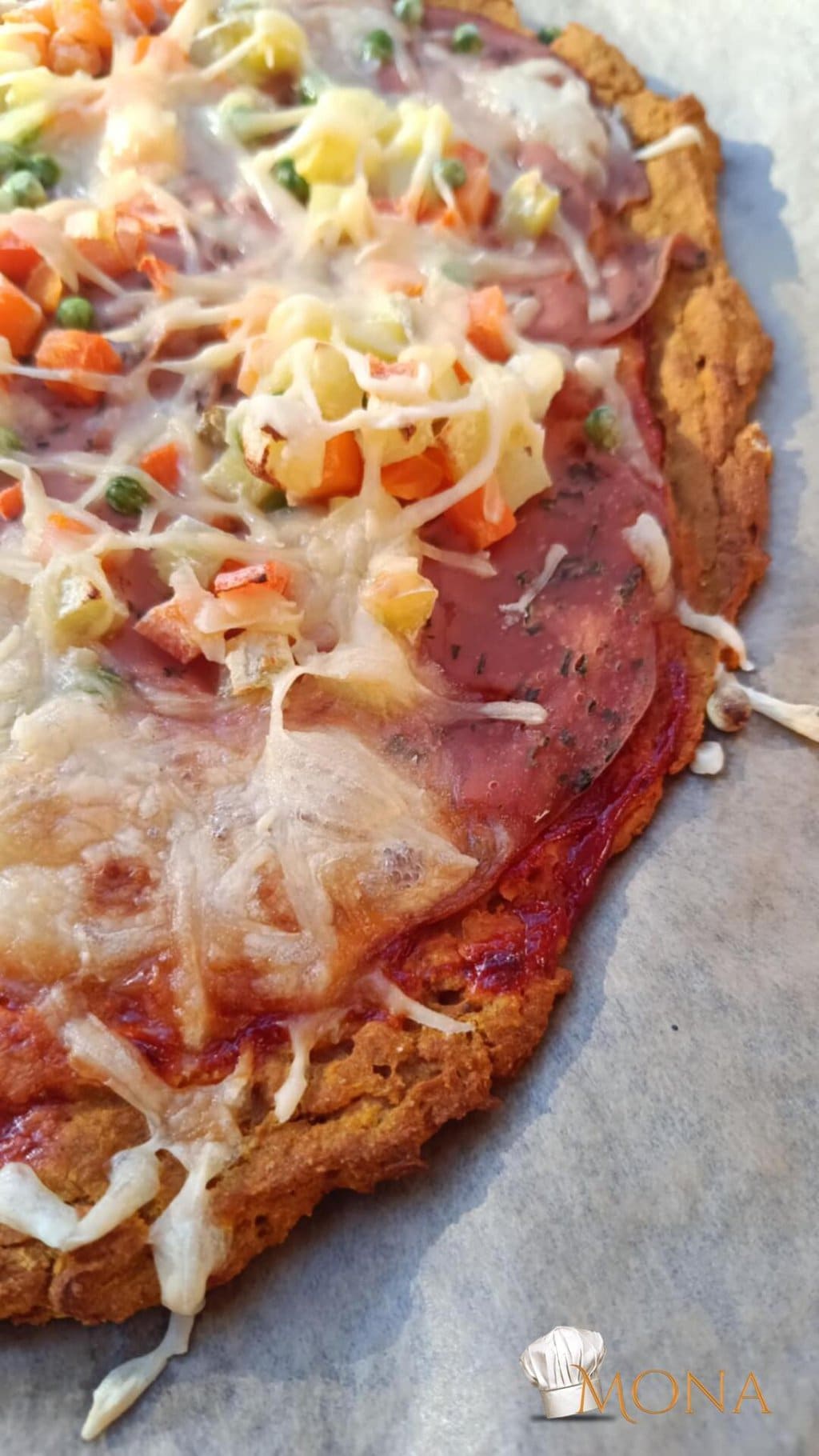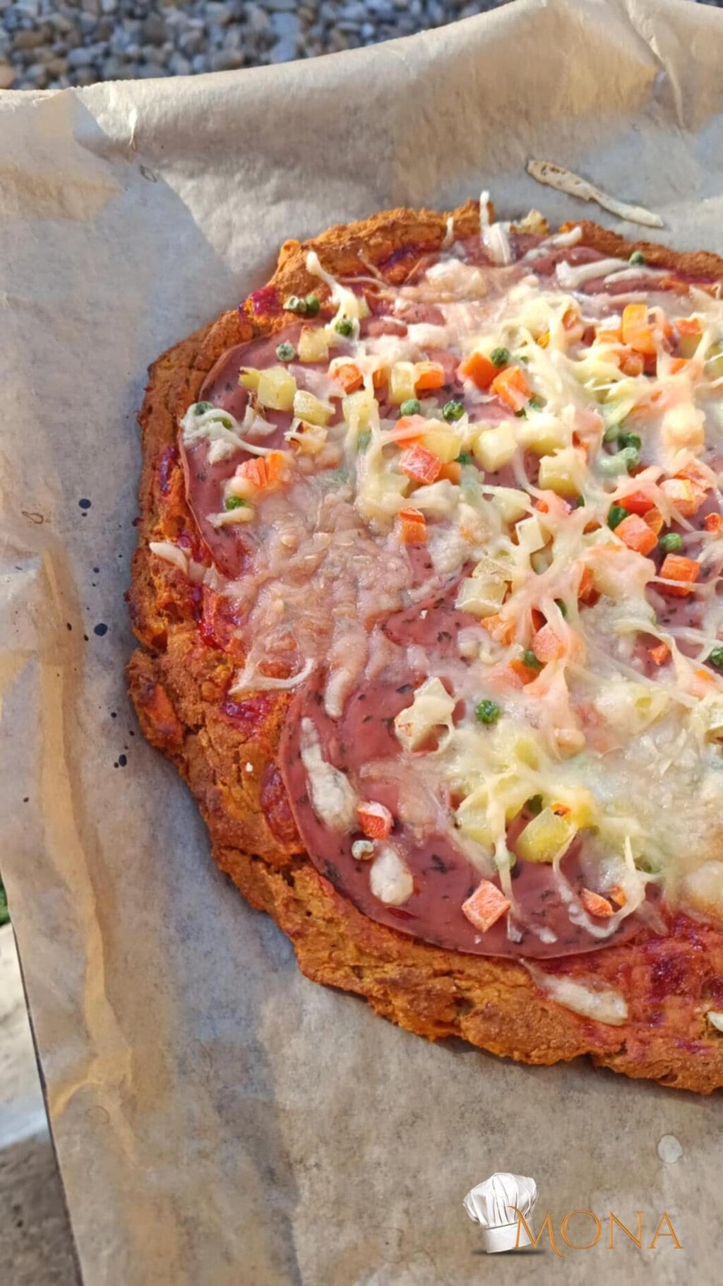 Majd egy kanál segítégével ütőpapírra tesszük a masszát, és egy nagy kört készítünk belőle ( kb. 32 – es pizza méret ).