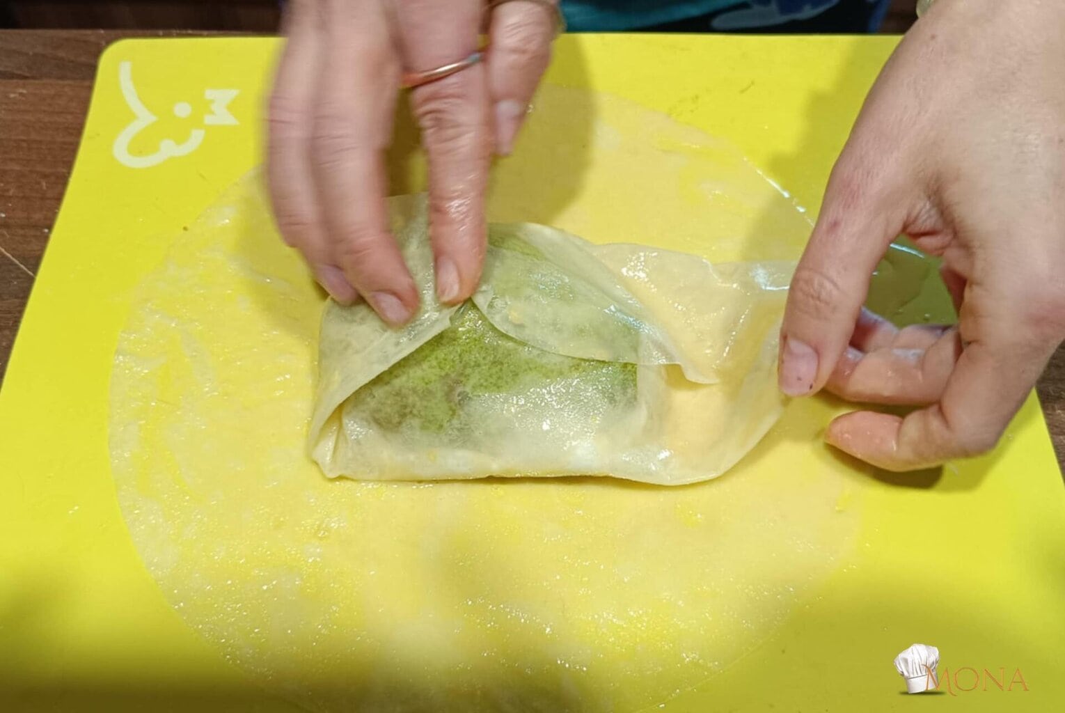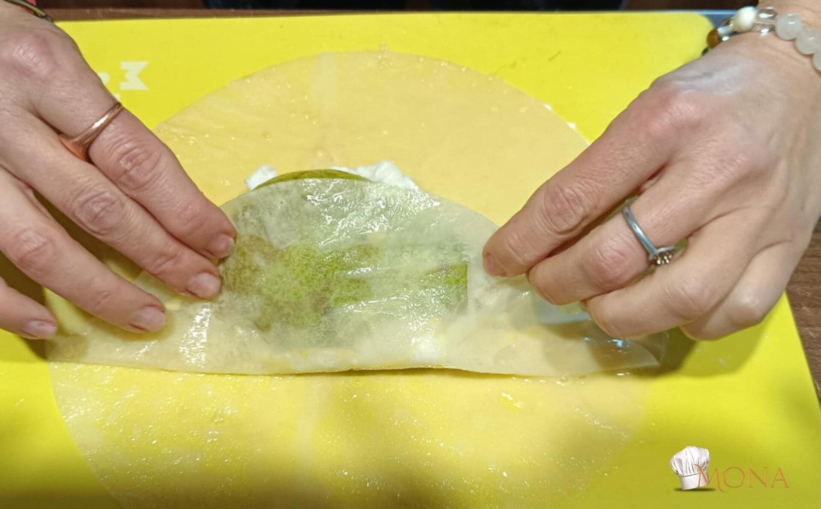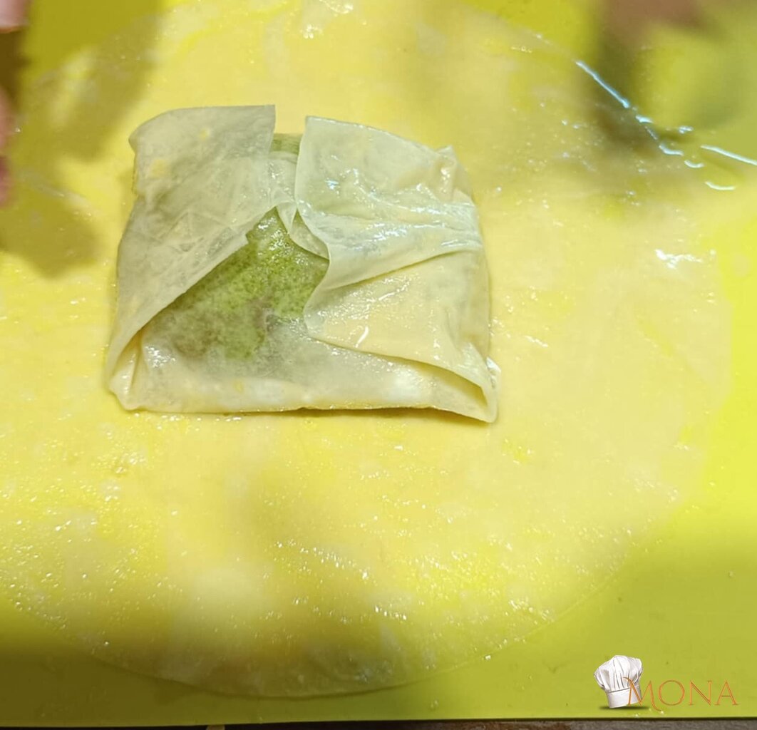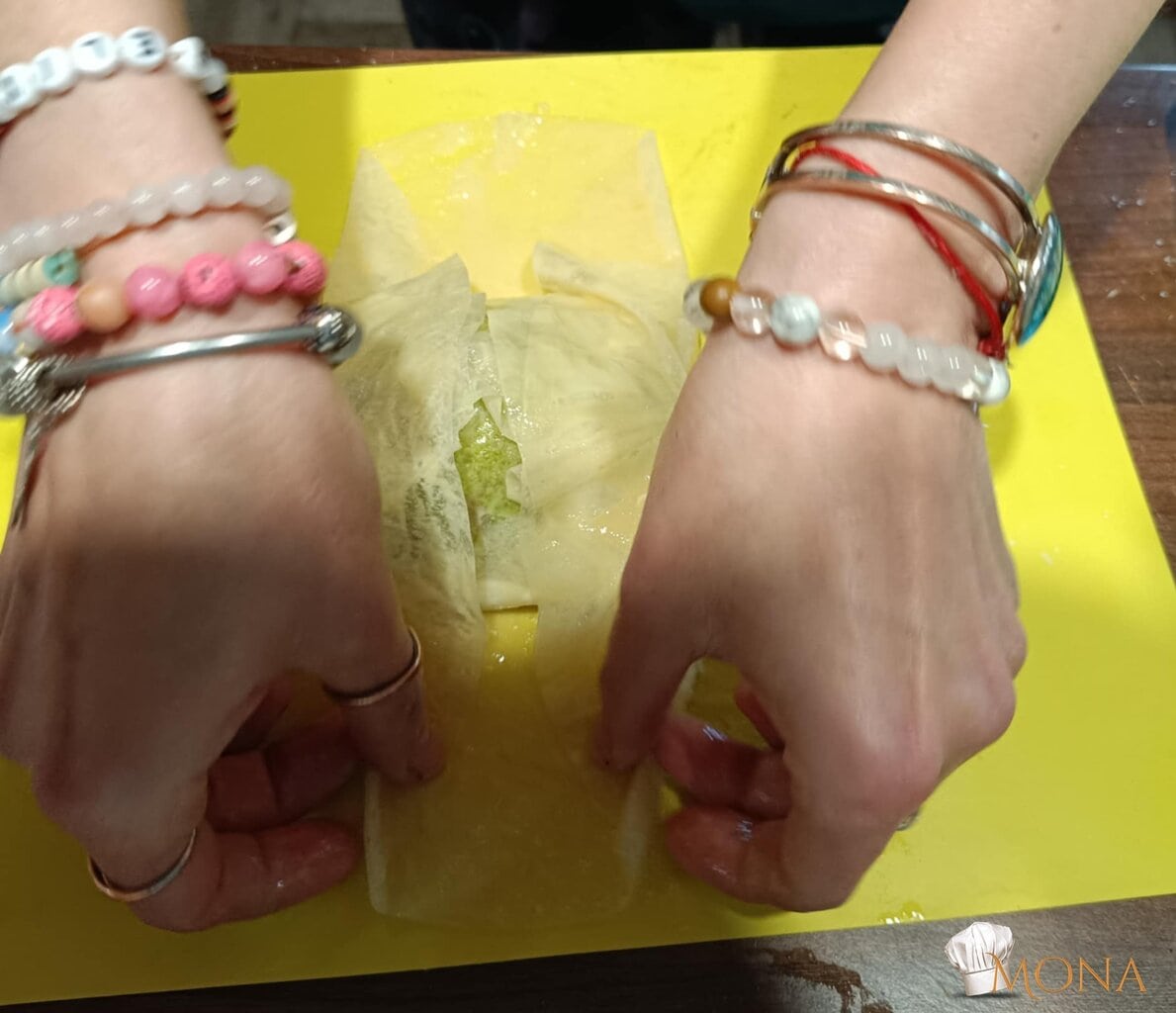 Megfogjuk a rizslapot – ugye kettő van egymáson – az egyiket ráhajtjuk a körtére – mint amikor batyut csomagolunk,majd utána a másik lapot is, de a másik irányból kezdjük.