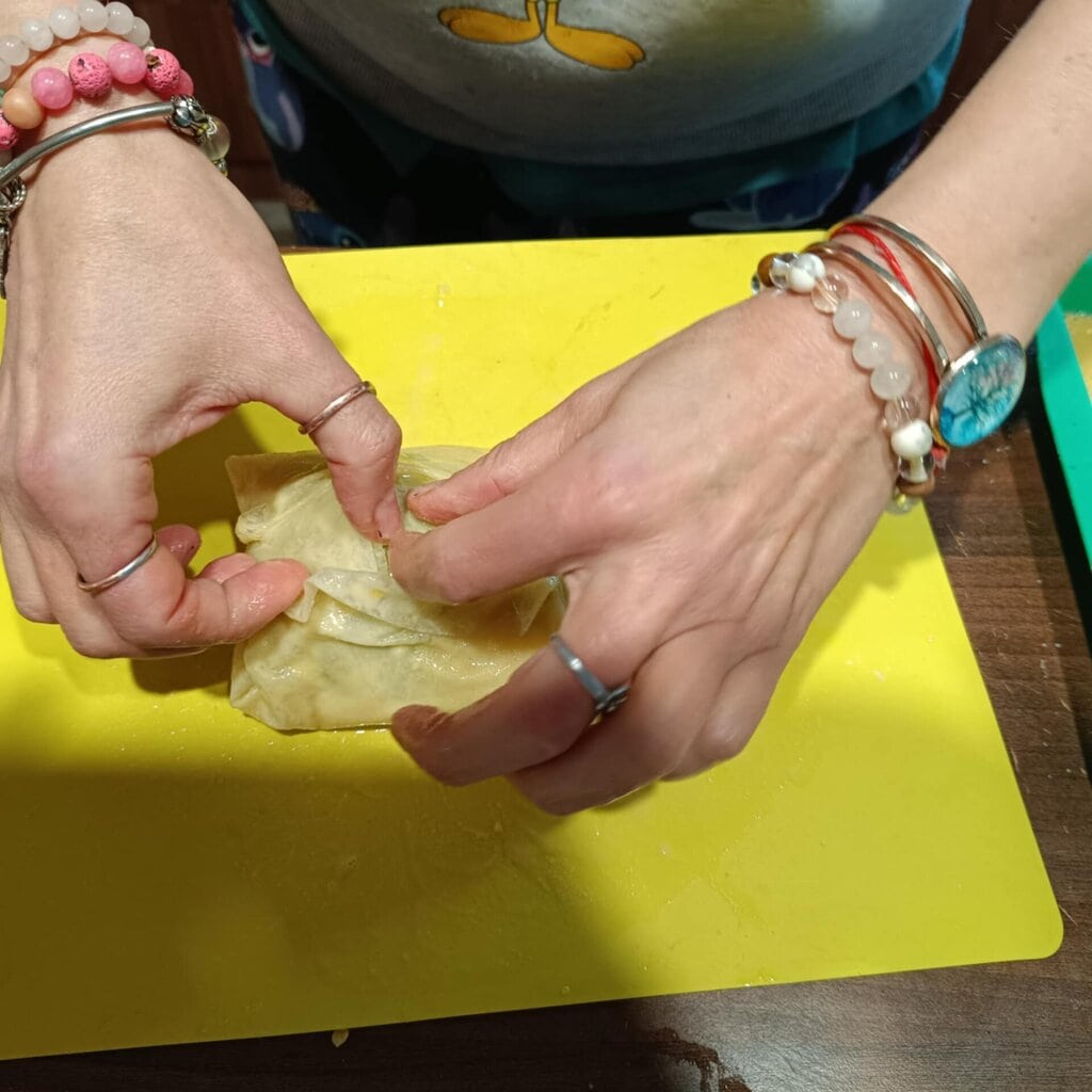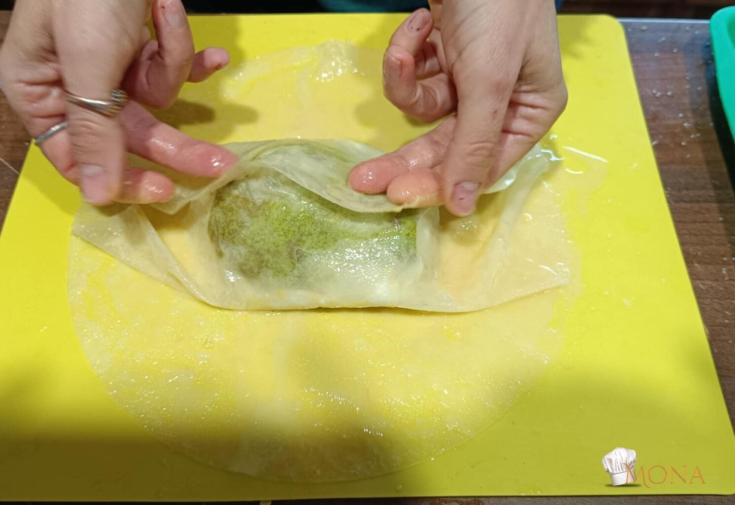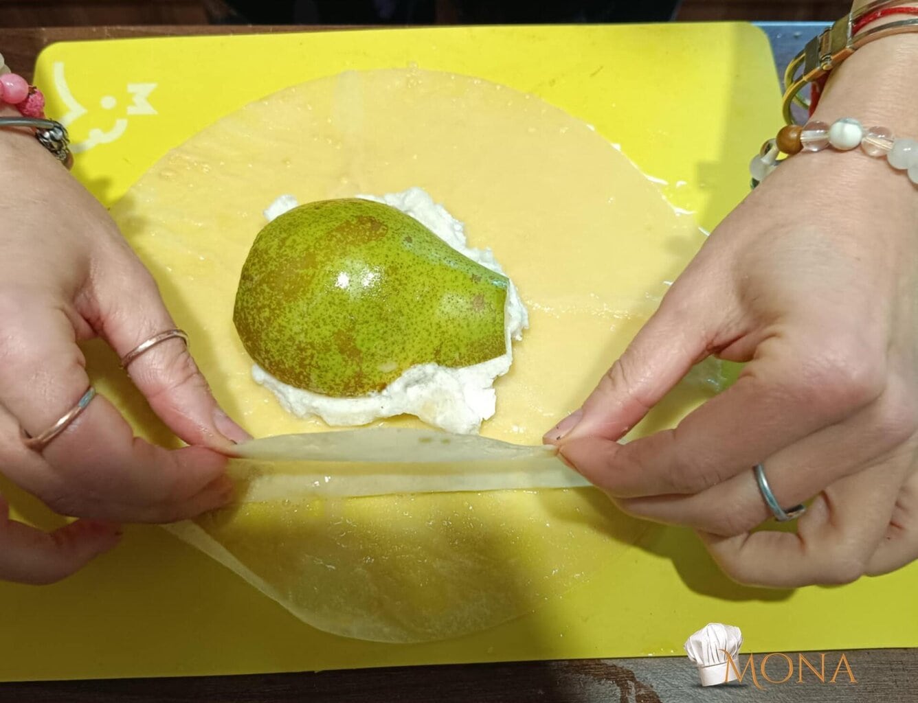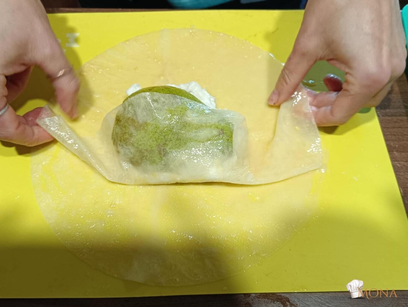 Megfogjuk a rizslapot – ugye kettő van egymáson – az egyiket ráhajtjuk a körtére – mint amikor batyut csomagolunk,majd utána a másik lapot is, de a másik irányból kezdjük.