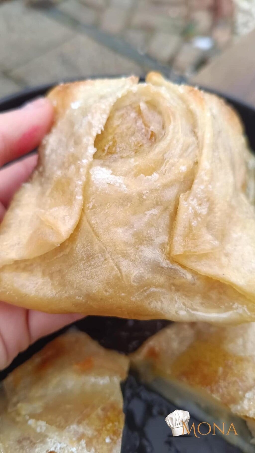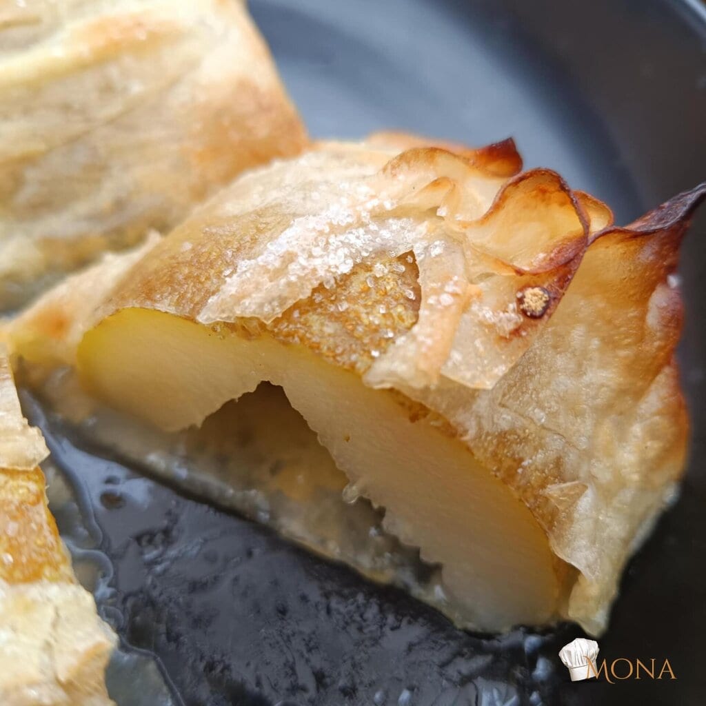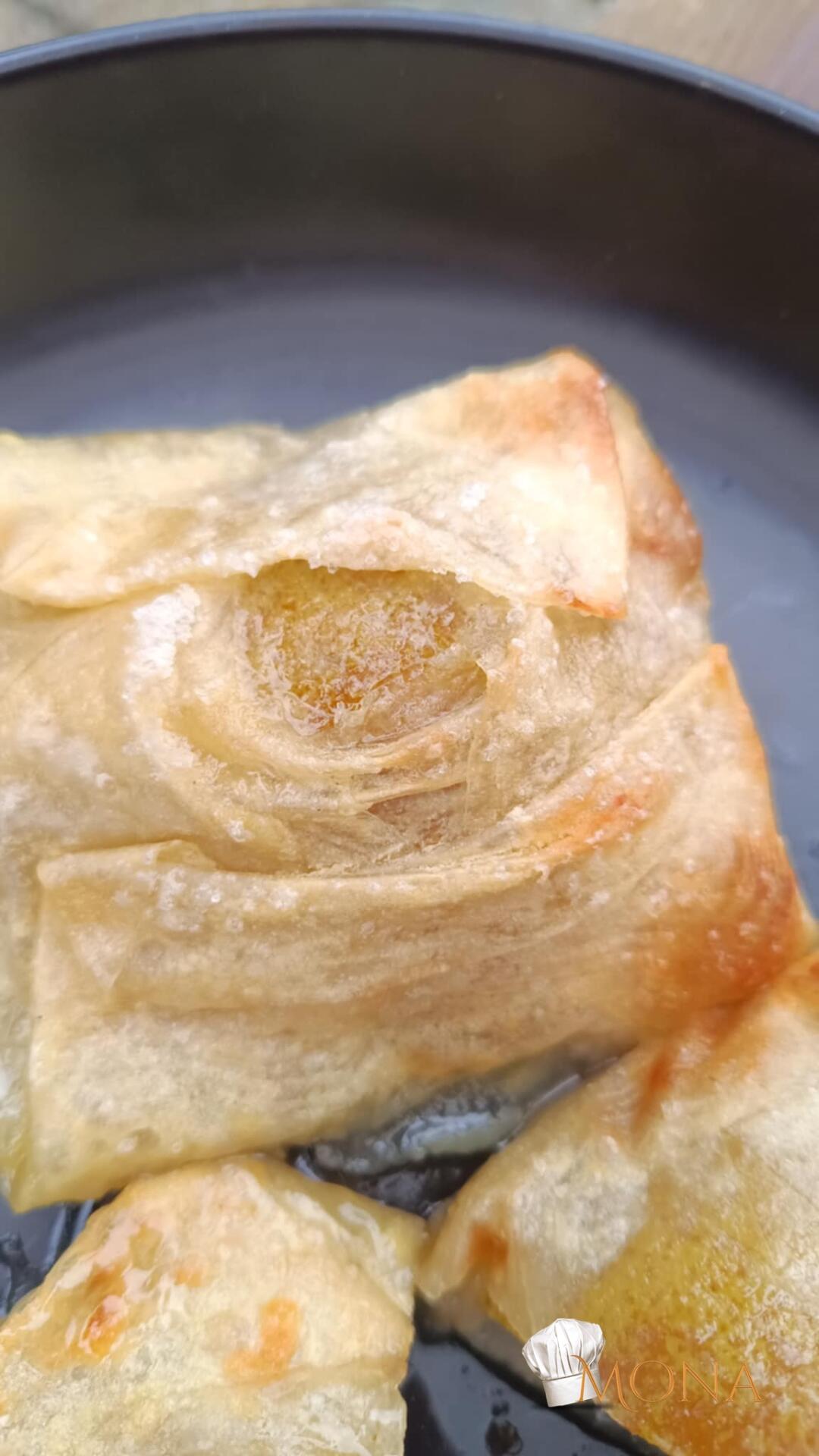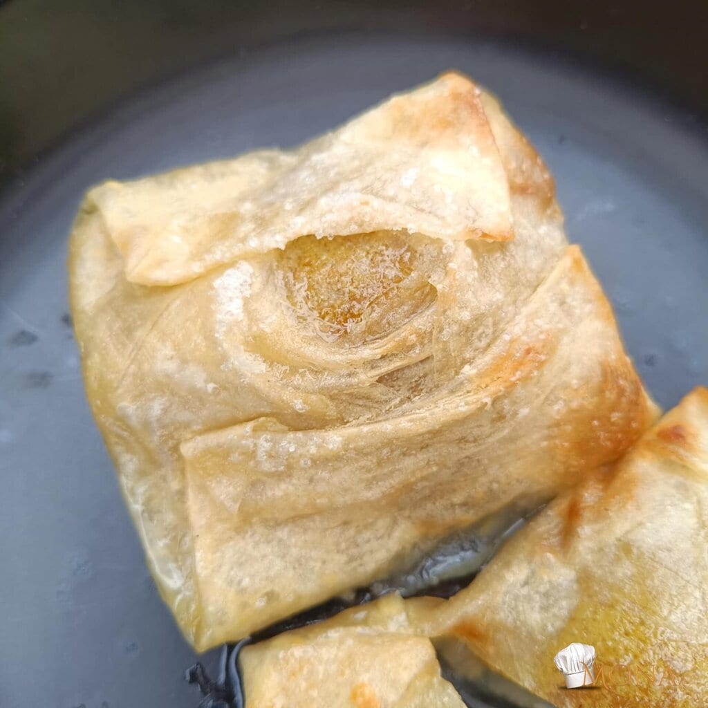 Megfogjuk a rizslapot – ugye kettő van egymáson – az egyiket ráhajtjuk a körtére – mint amikor batyut csomagolunk,majd utána a másik lapot is, de a másik irányból kezdjük.