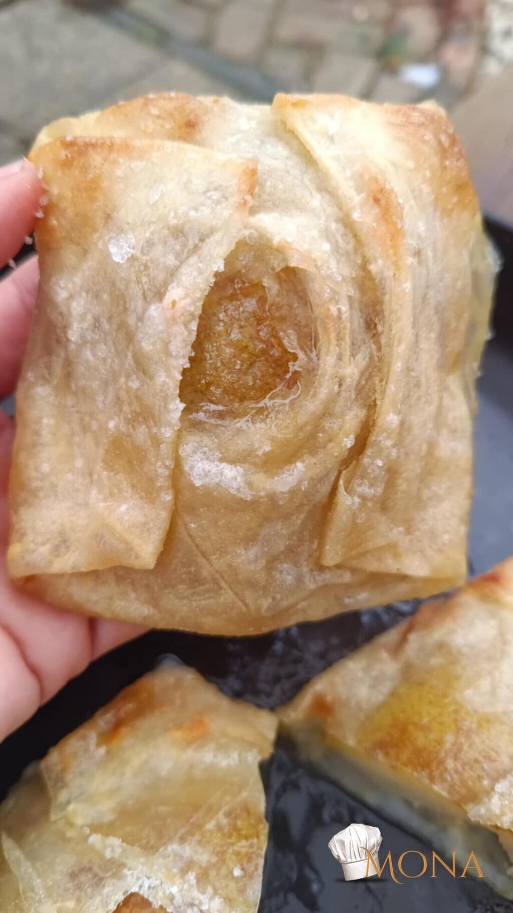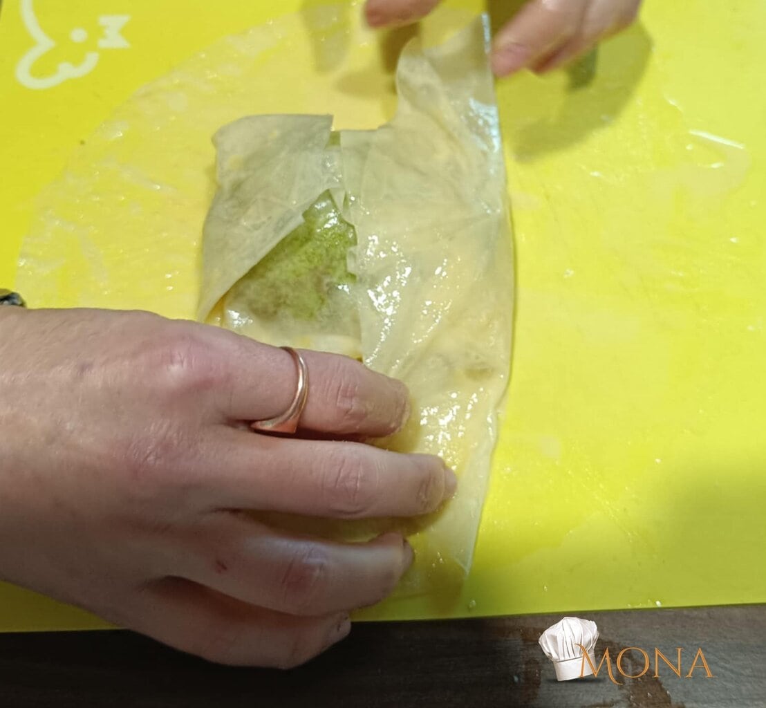 Majd rátesszük a rizslap közepére lefele – tehát a mascarponés krém lefele nézzen.