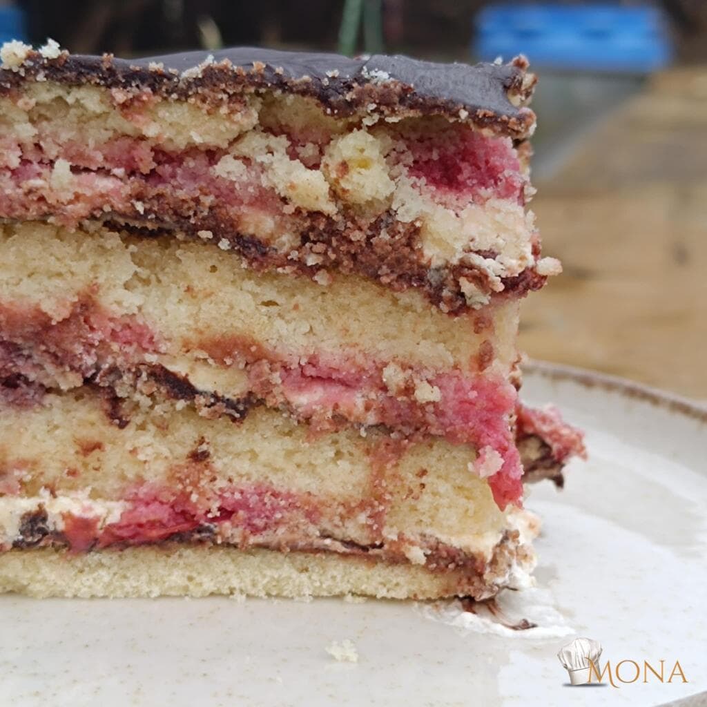 Tegyük egy sütőformába ( kb 20×20 asba beefér ), jön egy lap, olvasztott csoki, majd eper és a krém…. és ezt folytassuk,majd lezárjuk az utolsó piskótával és erre is csoki kerül.