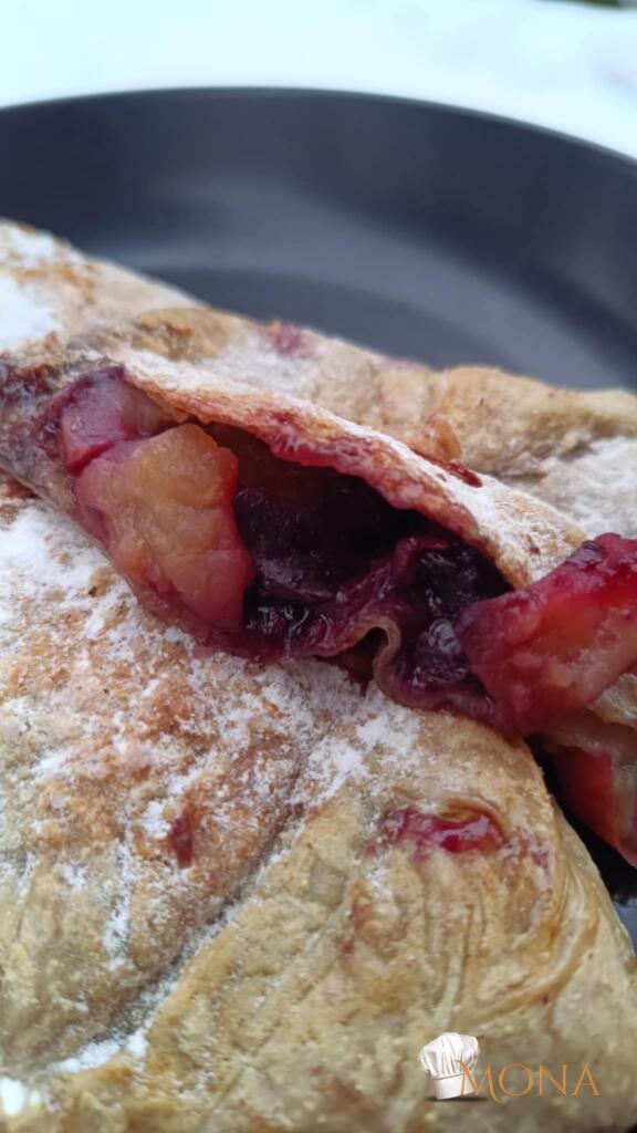 Egy másik lapot is jól megmártunk a keverékben, rátesszük a szilikon lapra, majd az előzőleg gyümölccsel megtöltött lapot az egyik oldalára tesszük, majd a másik oldalát ráhatjuk.