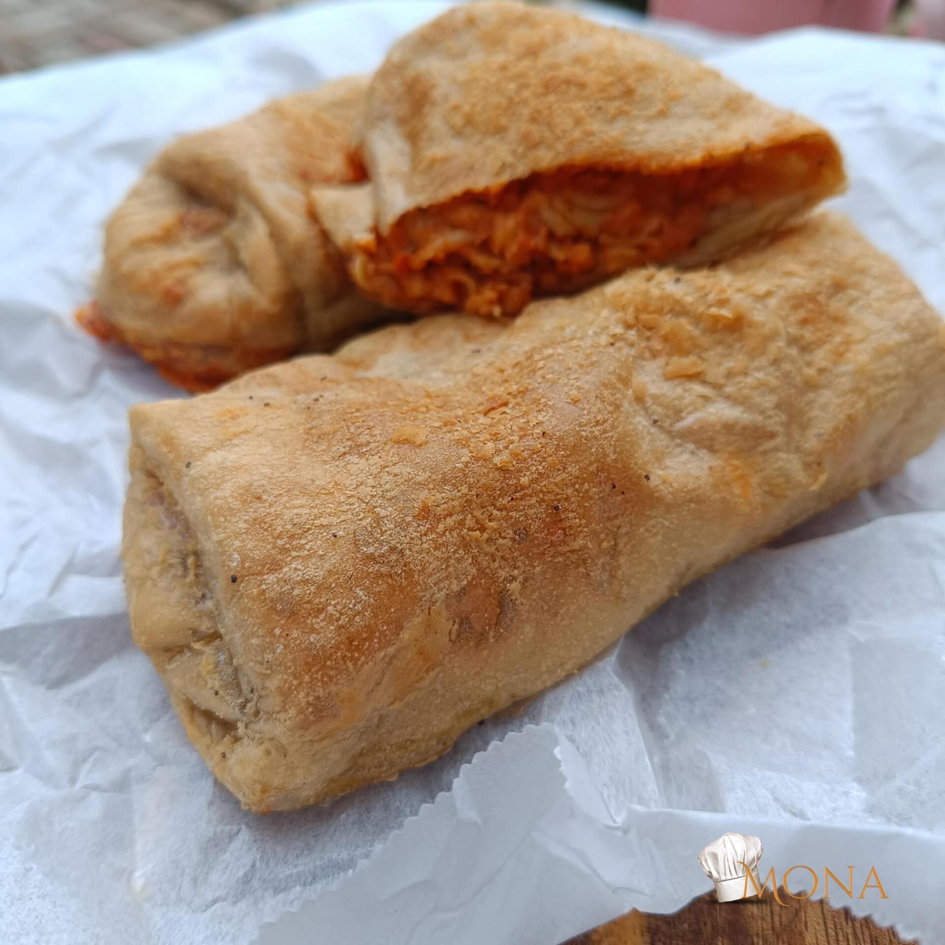 Két lapot egyesével megforgatunk benne, majd egymásra tesszük, erre teszünk a tésztás keverékből, két szélét ráhajtjuk, majd feltekerjük.