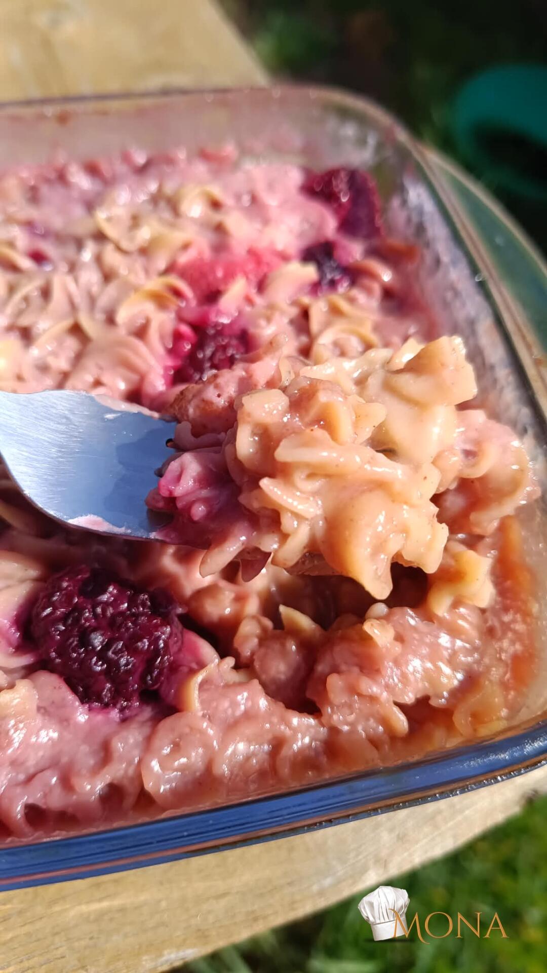 A gyümölcsöket kiolvasztjuk, majd összekeverjük a lekvárral és tejföllel, majd a tésztával.