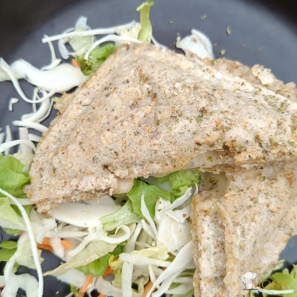 Majd egy melegszendvics sütőbe tesszük picit több, mint a felét, erre teszünk reszelt növényi sajtot, majd pedig a massza másik részét.